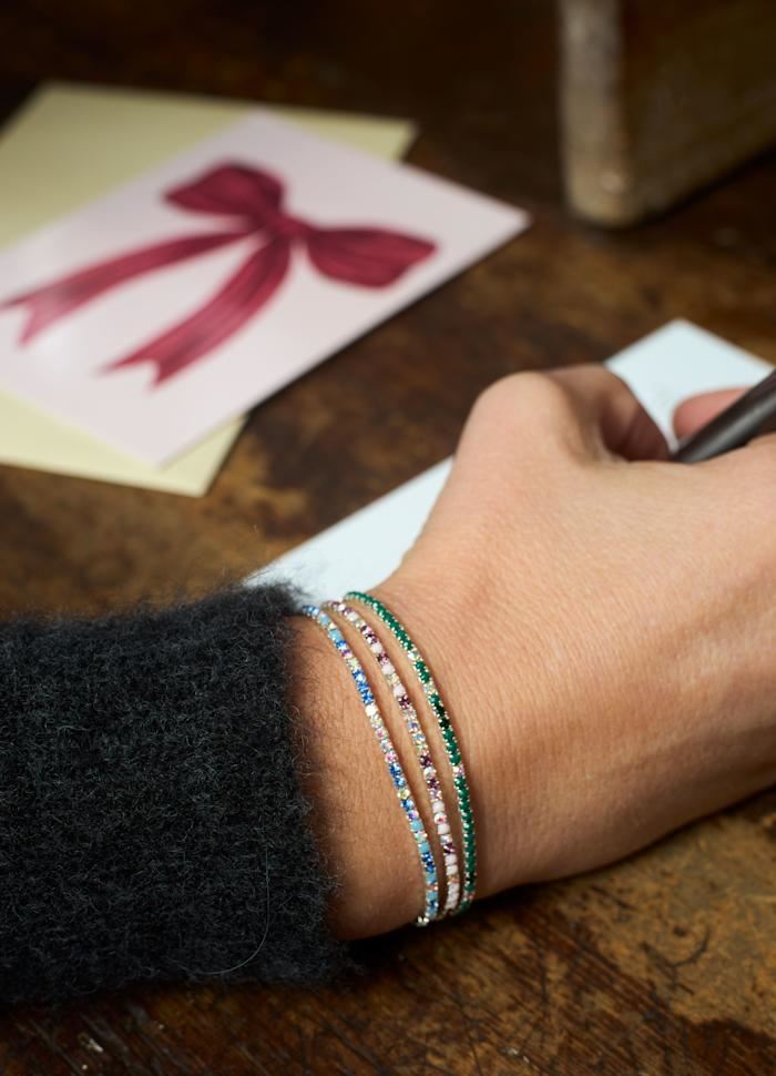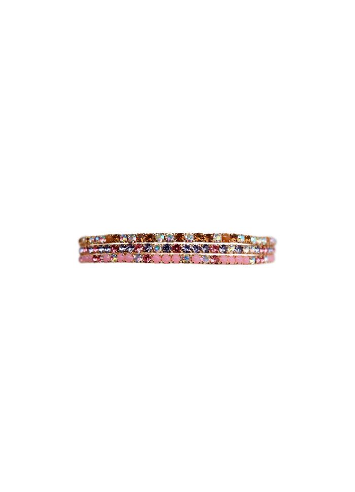 Smukt sæt med 3 funklende armbånd med elastisk snor. Sammensætningen af sten varierer for hvert armbånd.