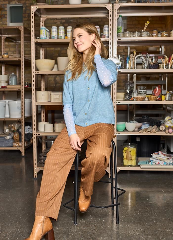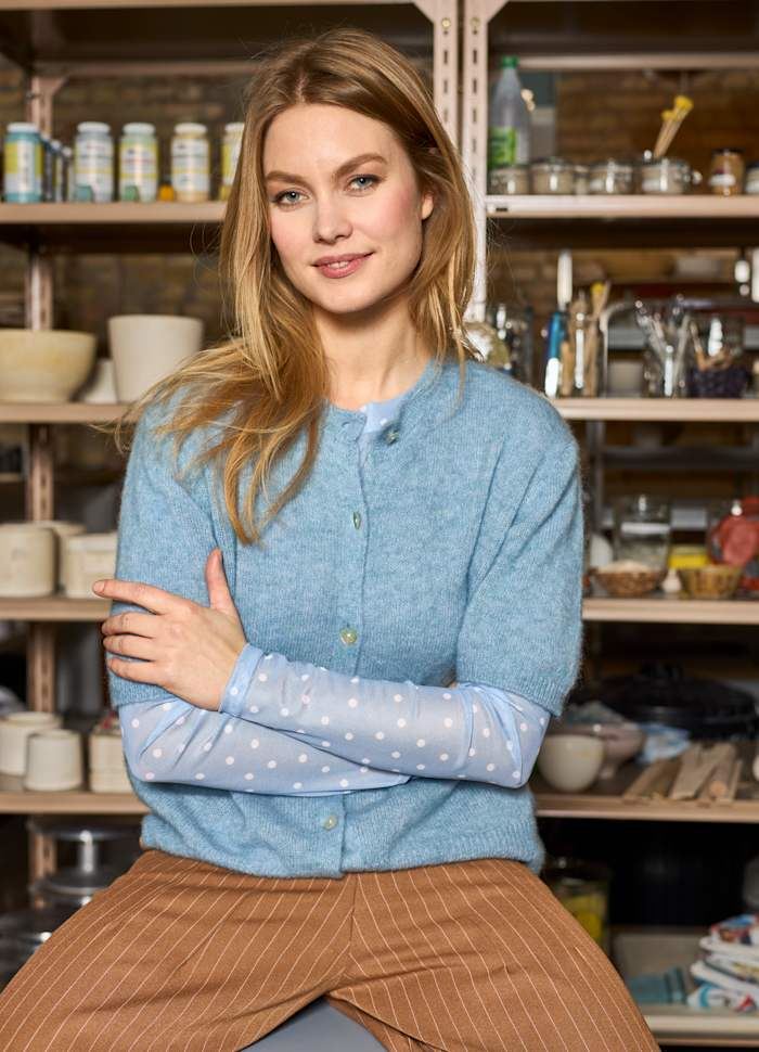 BCDELL SS Cardigan i lyseblå fra Black Colour er en let og feminin strikcardigan. Den er designet med korte ærmer og rund hals, hvilket giver et klassisk og tidløst udtryk. Cardiganen lukkes foran med små, fine knapper, som understreger det enkle design. Pasformen er let afslappet og behagelig, og det bløde, lette materiale gør den ideel til forår og sommer – både alene eller som et lag over en top eller kjole.