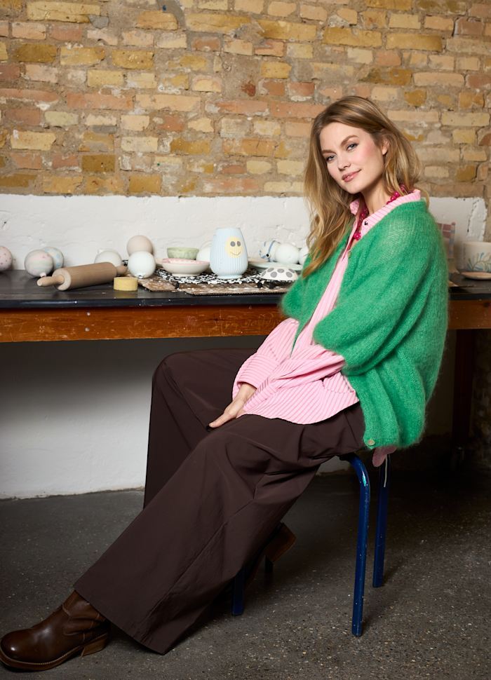 Skøn cardigan i blød, kraftig chunky strik med åben front og lange ærmer. Den løse pasform giver et moderne look og gør den nem at style til både kjoler og hverdagsoutfits. En alsidig favorit, du vil bruge igen og igen.