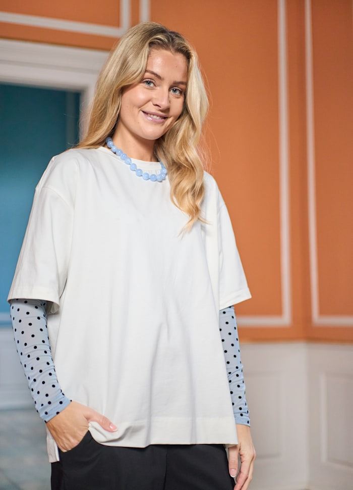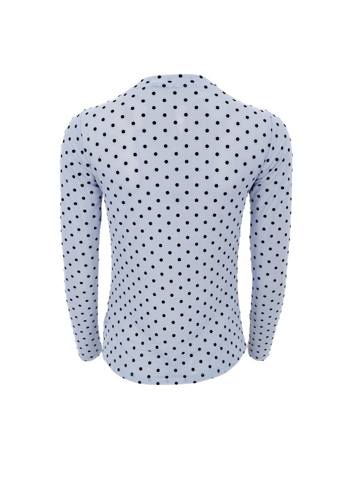 Langærmet meshbluse i let transparent kvalitet med stilfulde prikker. Modellen har rund hals og tætsiddende pasform, der giver et moderne og feminint look. Perfekt at style med en top under eller som lag-på-lag detalje til både hverdag og fest.