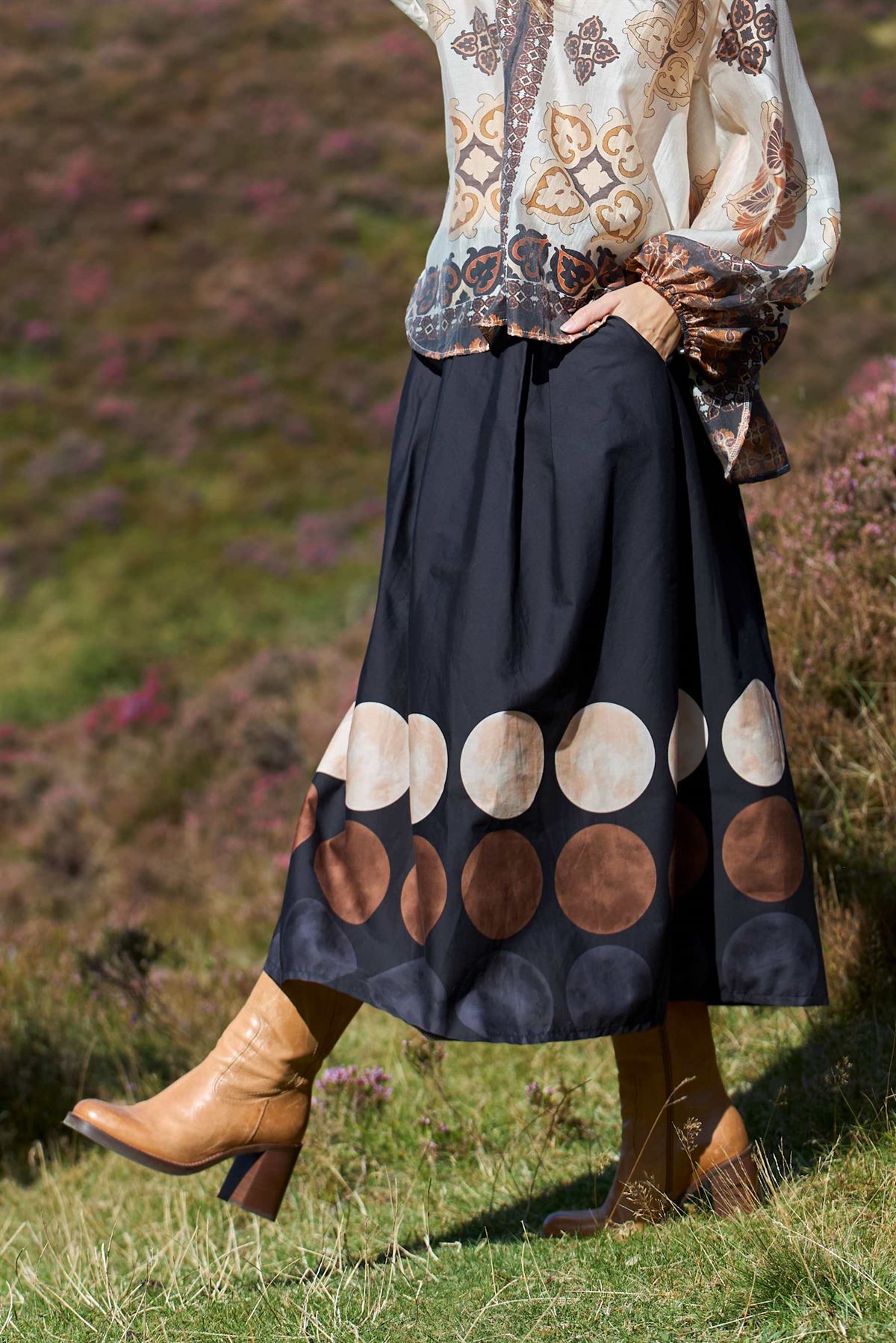 Flotteste nederdel i sort med et grafisk mønster langs kanten i varme nuancer. Nederdelen har mellemhøj talje med bæltestropper, læg foran og en løs, svingende pasform, der giver et feminint fald. En stilfuld nederdel, der kan styles både med skjorte, strik eller en enkel top alt efter anledning.
