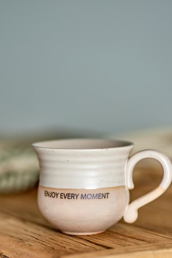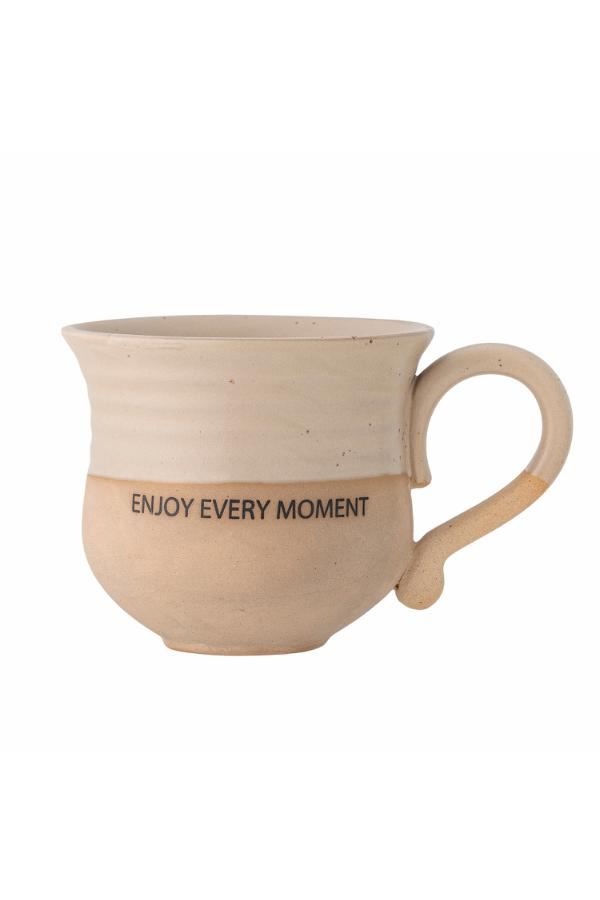 Claire Koppen fra Creative Collection er dekoreret med teksten ”Enjoy every moment”. Koppen er lavet af stentøj og toppen har en lys beige glasur. En hyggelig værtindegave. Gundet glasurens natur, kan farvevariationer forekomme.