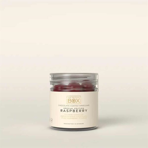 Forkæl dine sanser med vores eksklusive gelatinefri gourmet vingummi, overtrukket med bæredygtig premium hvid chokolade og afsluttet med et delikat lag af 100 % naturligt hindbærpulver fra Box The Original.