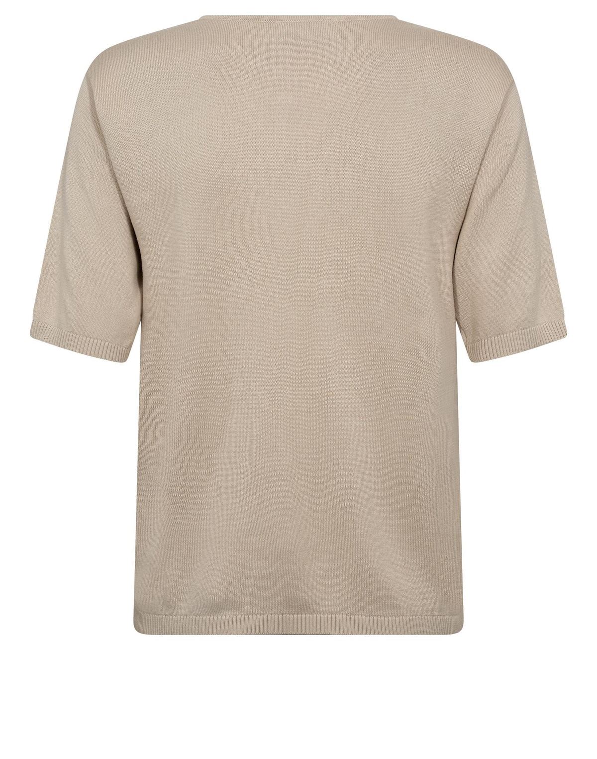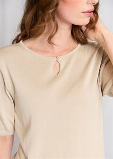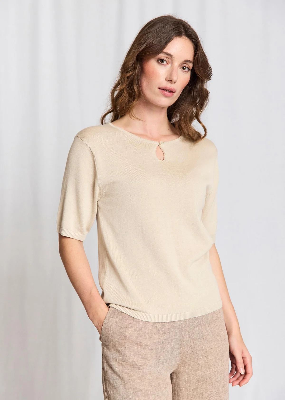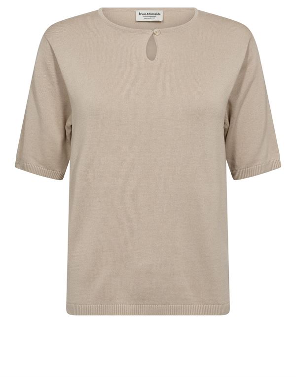 T-shirten er strikket i en blanding af bomuld og tencel og har en afslappet, tidløs silhuet. Den har en dekorativ åbning foran med knaplukning, som tilfører subtil detalje til designet.