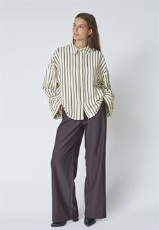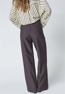 Elegante bukser med bred benvidde i en smuk mørkebrun nuance. Modellen har klassisk talje, skrålommer og lukning med hægte og lynlås, som giver et rent og feminint udtryk.