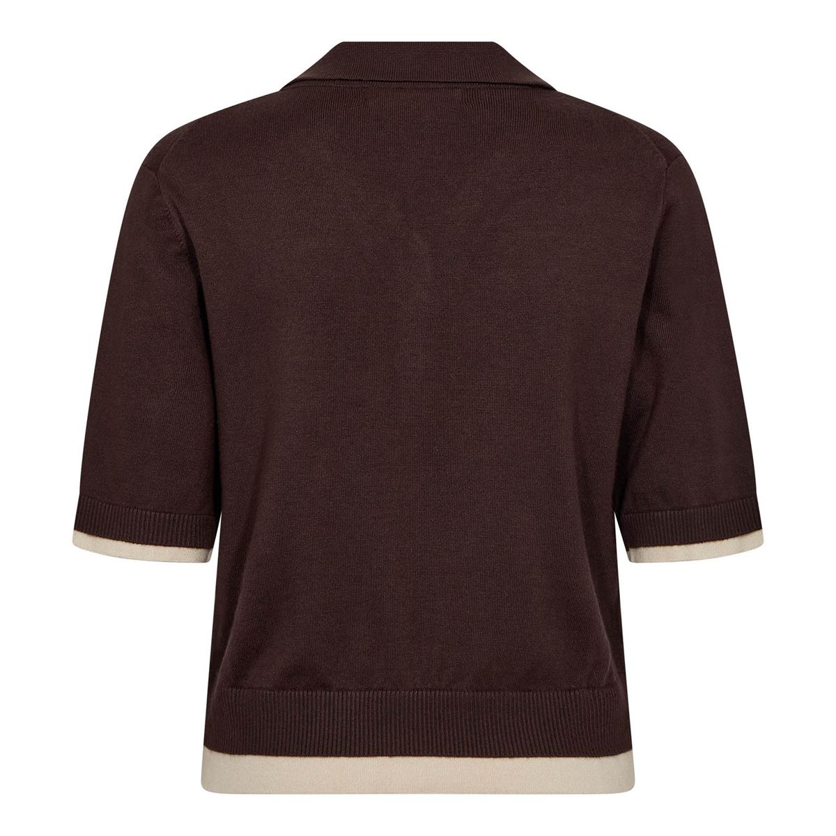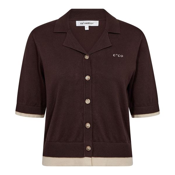 Co’Couture LueCC Crop Cardigan i mørkebrun er en cropped cardigan med korte ærmer og knapper foran. Den har kontrastfarvede kanter og et lille CC-logo, der giver et moderne og casual look. Cardiganen er lavet i blødt, let strik, som gør den behagelig at have på og velegnet til hverdag og lag-på-lag outfits.