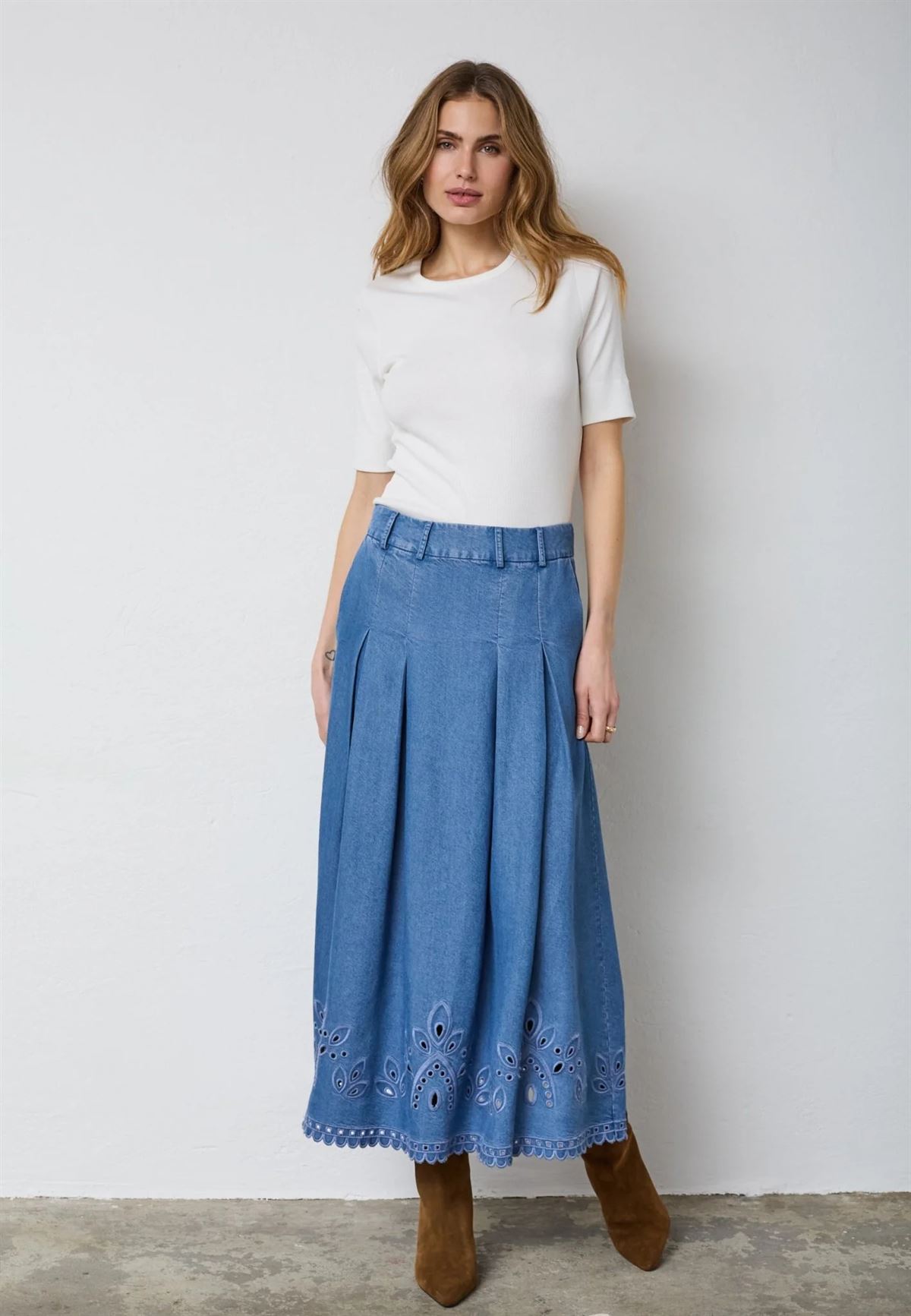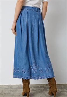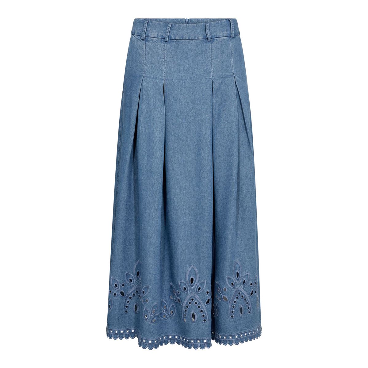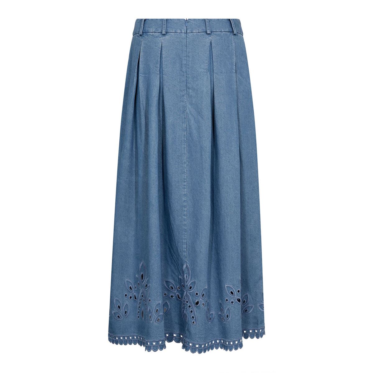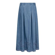 Elegant plisseret nederdel fra Co`Couture i smuk denimblå med flot broderi, der giver et feminint og moderne touch. A-formet pasform sikrer komfort og en flatterende silhuet. Perfekt til både hverdag og fest, og nem at style med bluser, strik eller sneakers.