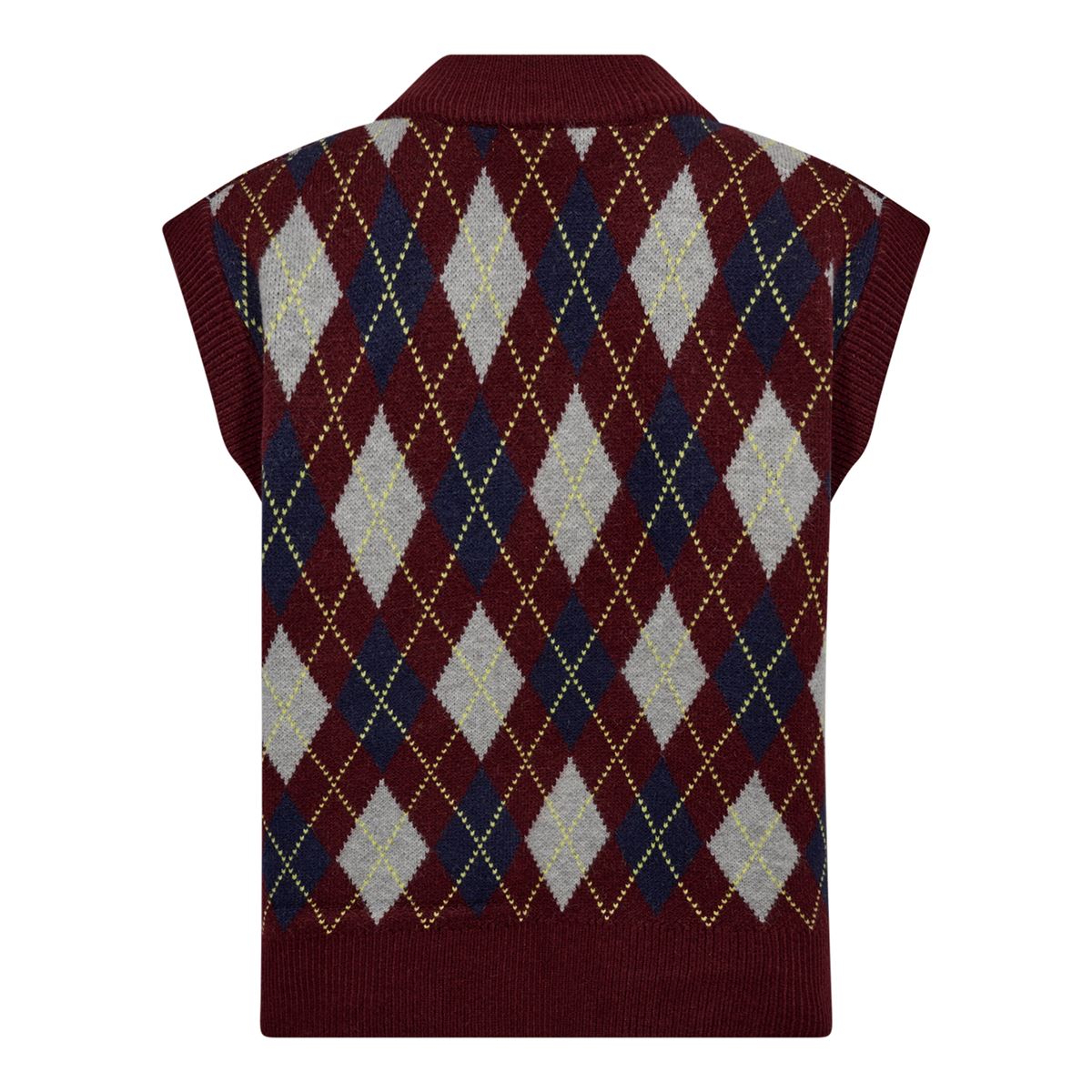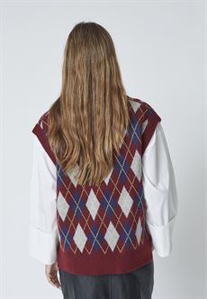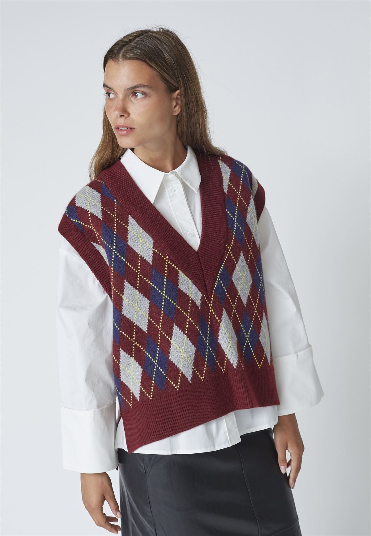 Co’Couture RowCC Check Vest i winered er en strikket, ærmeløs vest med klassisk ternet (argyle) mønster i varme vinrøde nuancer med kontrastfarver, der giver en moderne og stilfuld detalje til ethvert outfit.