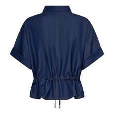 Designet med to brystlommer med flap og markante kontraststikninger, der fremhæver det klassiske denimlook. Korte ærmer med opsmøg samt en justerbar talje med bindebånd foran og elastik bagpå sikrer en fleksibel og feminin pasform. Den let peplum-inspirerede afslutning forneden skaber en flatterende silhuet.