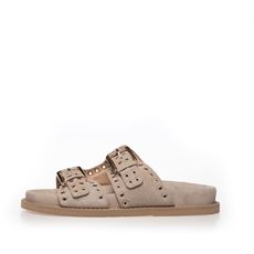 Slip in sandaler med cool nitte detaljer og spænder i guldmetal. Sandalerne er lavet i blødt ruskind og har bløde indersåler i ruskind, foret med vores gode latex indersål