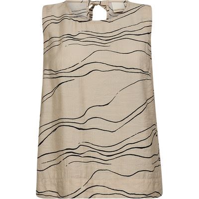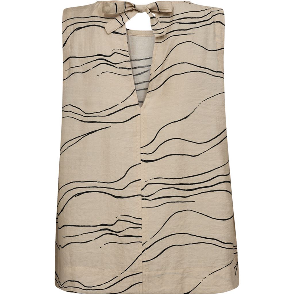Toppen er enkel og stilfuld med en smuk detalje på ryggen, hvor den lukkes med et bindebånd i nakken. Den har en feminin pasform uden ærmer, hvilket gør den ideel til varmere dage eller som et lag under en jakke. V-udskæringen på ryggen og de små slidser i siden tilføjer et sofistikeret præg.