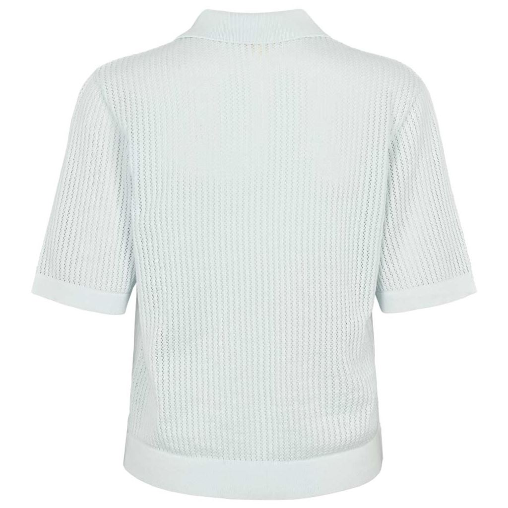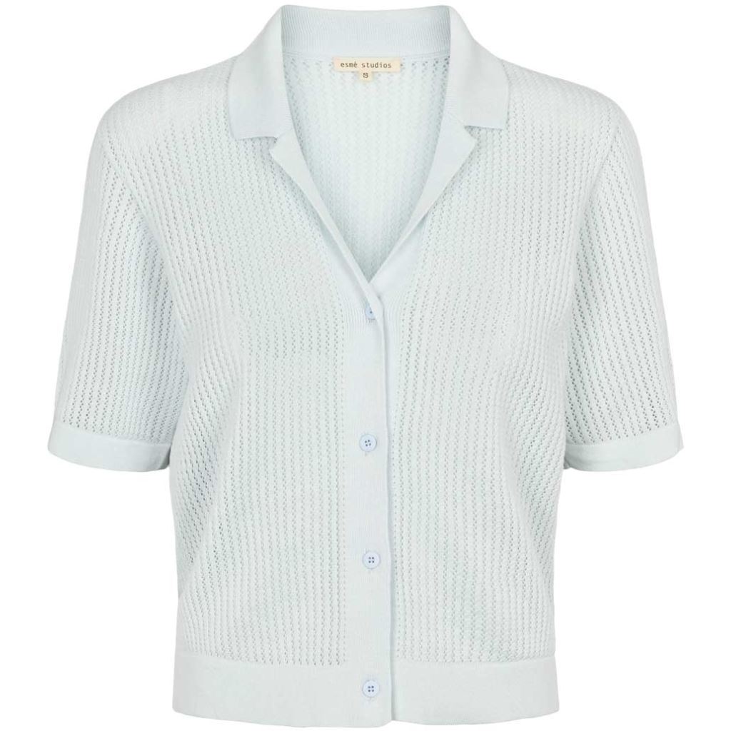 ESMÈ STUDIOS Esnola SS Knit Cardigan i pale blue er en let og elegant cardigan, designet til både hverdag og mere formelle lejligheder. Fremstillet i blødt GOTS-certificeret materiale, der er både bæredygtigt og behageligt mod huden.