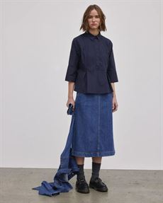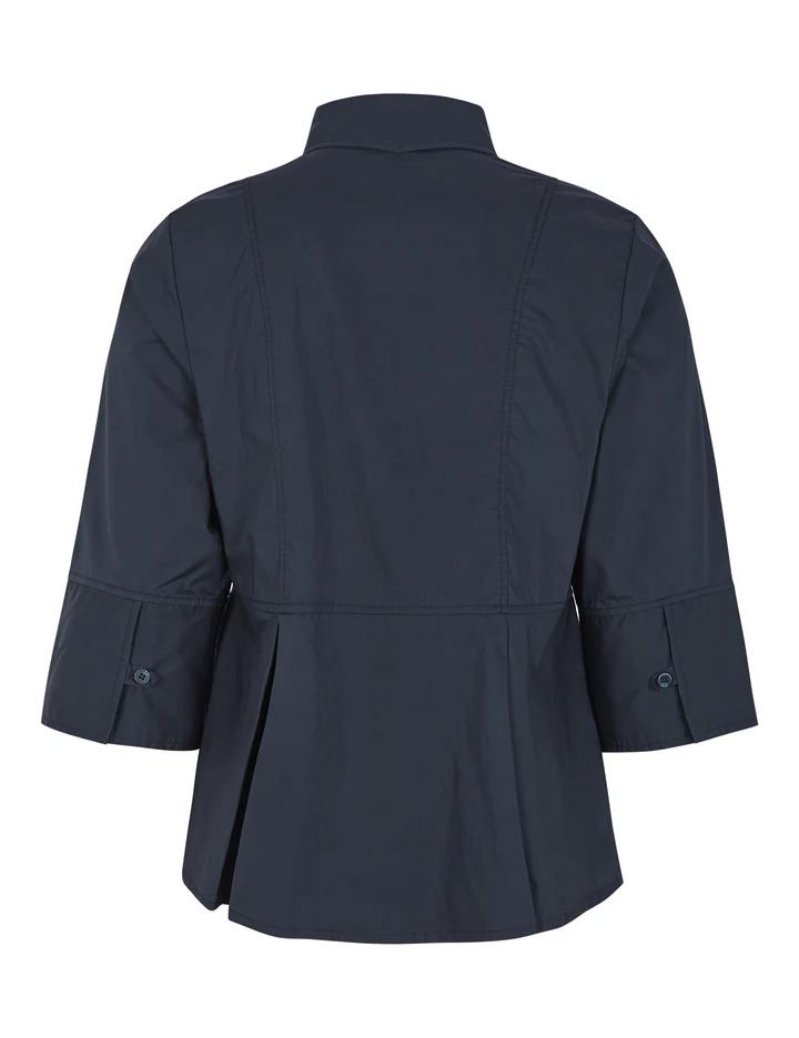 Feminin skjorte fra Esmé Studios i blå.  Ærmerne er 3/4 lange med knap forenden. Skjorten har knapper ned foran til taljen og fra taljen har den et peplum med læg som giver den det elegante udtryk. Den er lavet i bomuld og er almindelig i størrelsen.