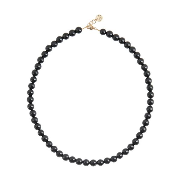 Color halskæden fra Friihof+Siig er designet med sorte og runde perler. Halskæden lukkes ved hjælp af den guldfarvede lås bagpå, der er justerbar.
