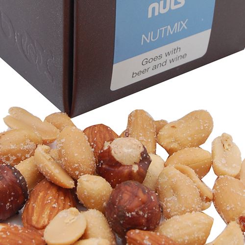 Saltet nøddemix. Leveres i brun “folde-ud” æske. 90g