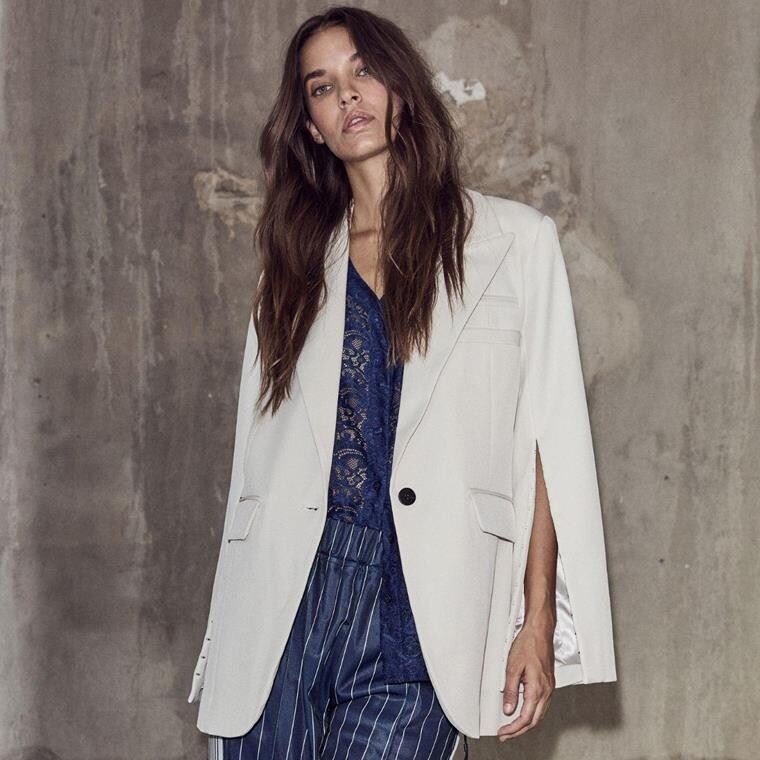 Designet er inspireret af tuxedo-stilen med reverskrave, let polstrede skuldre og en enkel lukning foran, som giver et stilrent og sofistikeret udtryk. Den flatterende pasform gør den ideel både over en kjole eller stylet med bukser for et komplet suit-look.