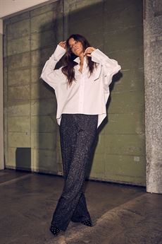 Bukserne er fremstillet i en blød og elastisk strikkvalitet med lurextråde, der fanger lyset på den helt rigtige måde. Den højtaljede pasform og det lige ben giver et flatterende og komfortabelt look, perfekt både til hverdagsbrug og festlige anledninger.