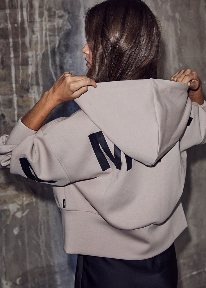 Haute L’Amitié Maxi Split Zip Hoodie i en stilren beige farve. En moderne hoodie med gennemgående lynlås, hætte med snører og et diskret HAUTE-logo på brystet.