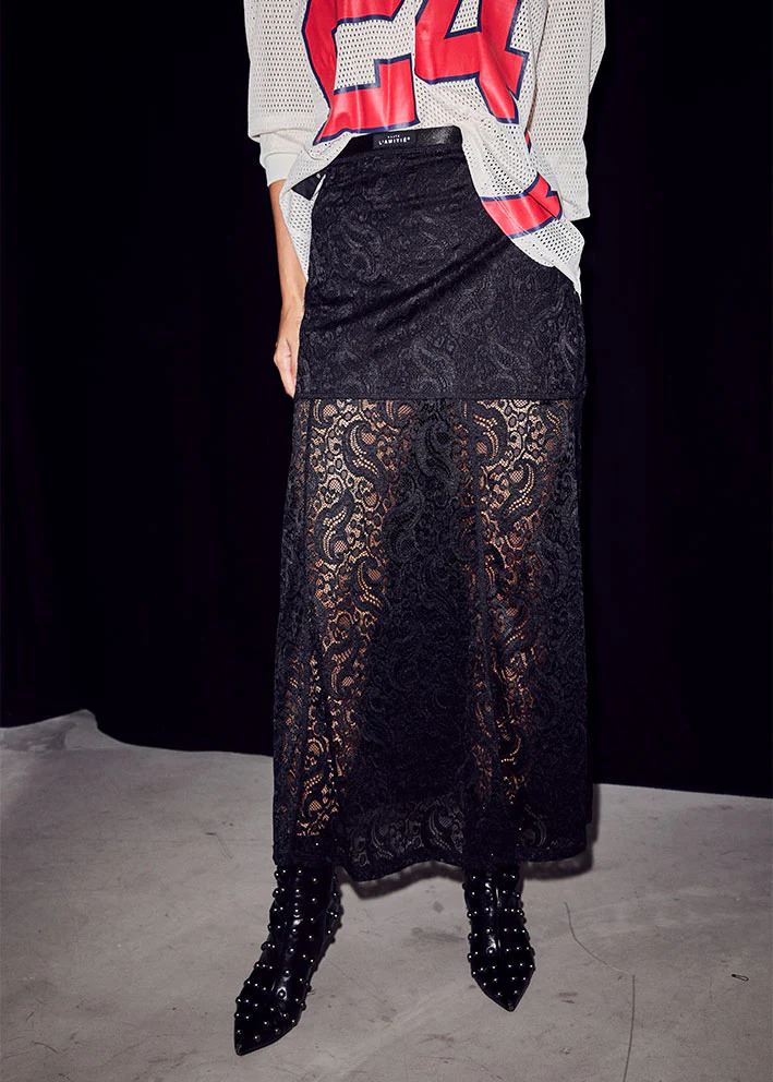 Elegant maxi-nederdel fra Haute L’amitié med smukt blondeoverlay og elastisk talje for perfekt komfort. Nederdelen har et let gennemsigtigt look fra lårene og ned, mens det bløde underskørt giver god dækning. Klassisk sort farve og feminin A-formet silhuet, der både kan styles til hverdag og fest.