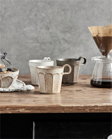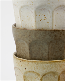 Denne smukke håndlavede kop i stentøj tilføjer dit hjem et strejf af rustik charme og personlig atmosfære. Den passer perfekt til din morgenkaffe, te eller dine varme kakao, og hver kop er håndlavet og derfor helt unik. Sættet inkluderer farverne off-white, beige og grøn.