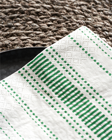 Papirservietter er et must til ethvert måltid. Denne pakke med 40 papirservietter kaldet Code er designet af House Doctor. Det grønne mønster med hvid baggrund passer til en bred vifte af stel, fra hvidt porcelæn til rustikt stentøj i en mørkere farve. Brug servietterne til morgenmad, aftensmad og mellemmåltider. Tag dem med på udflugter eller placer en stak af dem på middagsbordet, så du og din familie selv kan tage for jer. Det alsidige og moderne design vil snart blive en del af ethvert måltid.