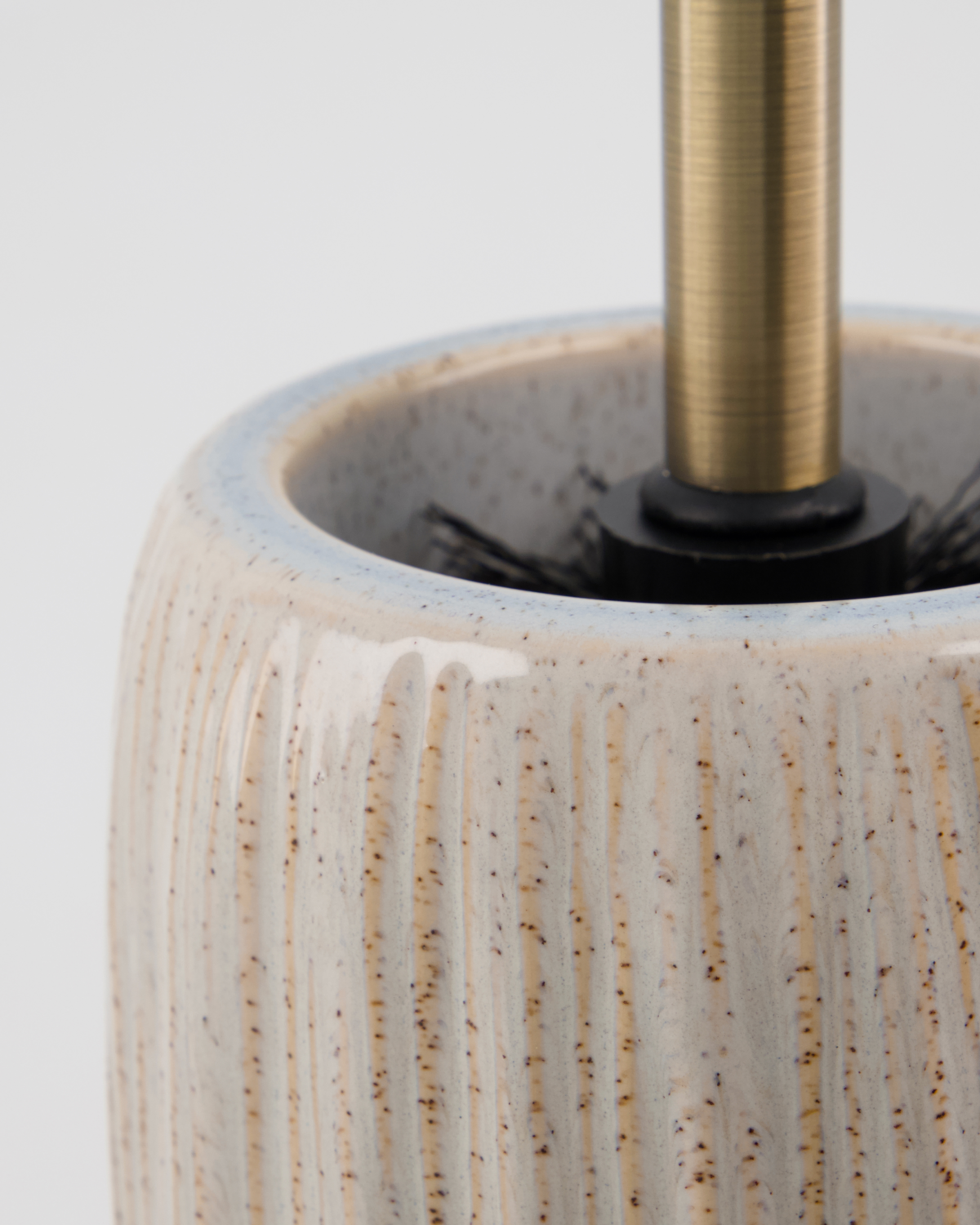 Gør dit badeværelse mere sofistikeret med dette keramiske toiletbørstesæt med en råhvid glasur, der giver et raffineret touch til enhver indretning. Sættet kombinerer funktionalitet med stil med sit gyldne håndtag i rustfrit stål, som giver en luksuriøs accent. Leveres med et ekstra børstehoved for nem vedligeholdelse, der sikrer hygiejne og lang levetid.