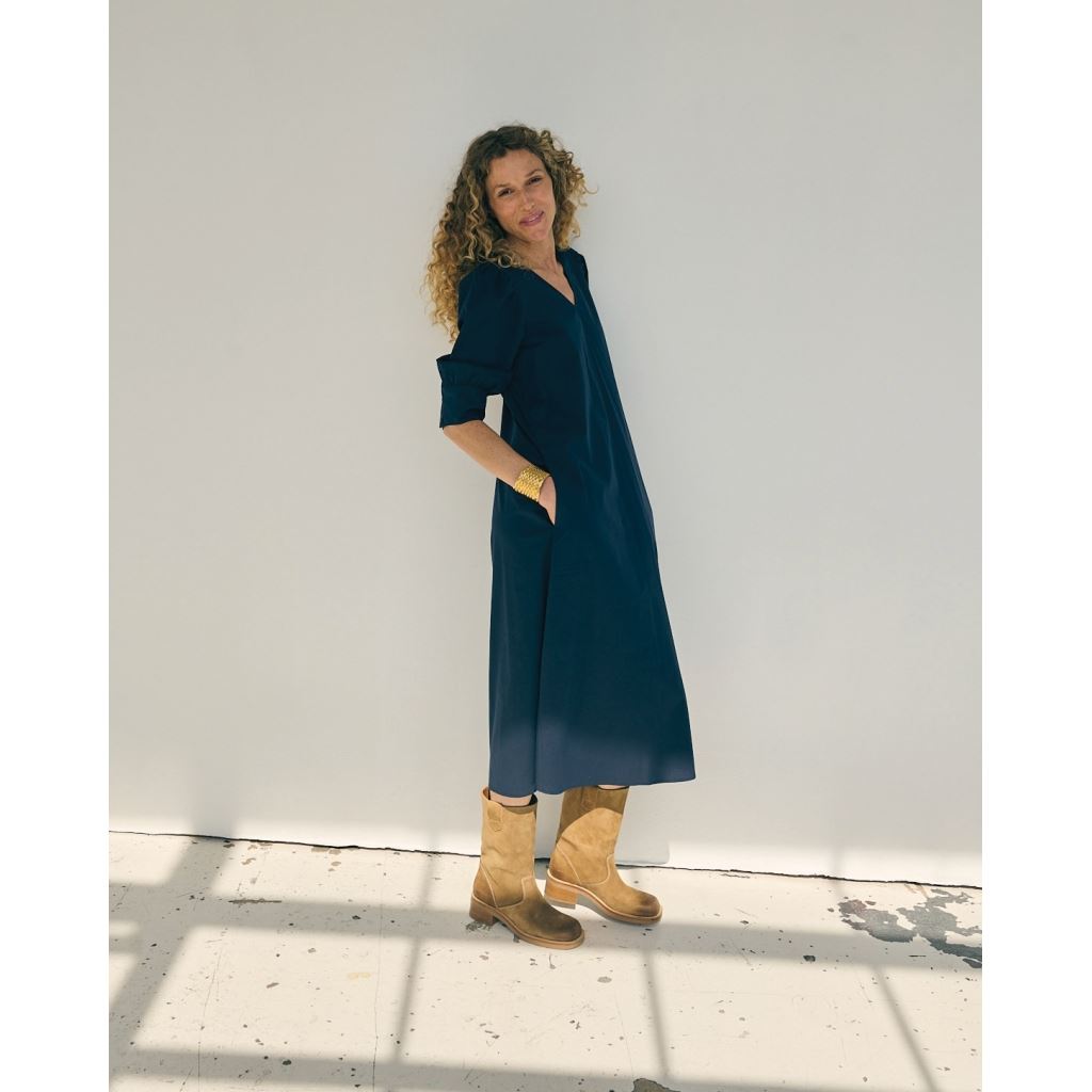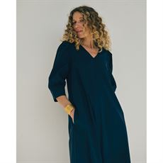 Kjolen har en feminin V-udskæring og 3/4-ærmer med en let ballon-effekt, der giver et blødt og elegant udtryk. Det tidløse snit gør den nem at style – brug den med sneakers til et afslappet hverdagslook, eller med støvler og accessories for et mere poleret outfit.