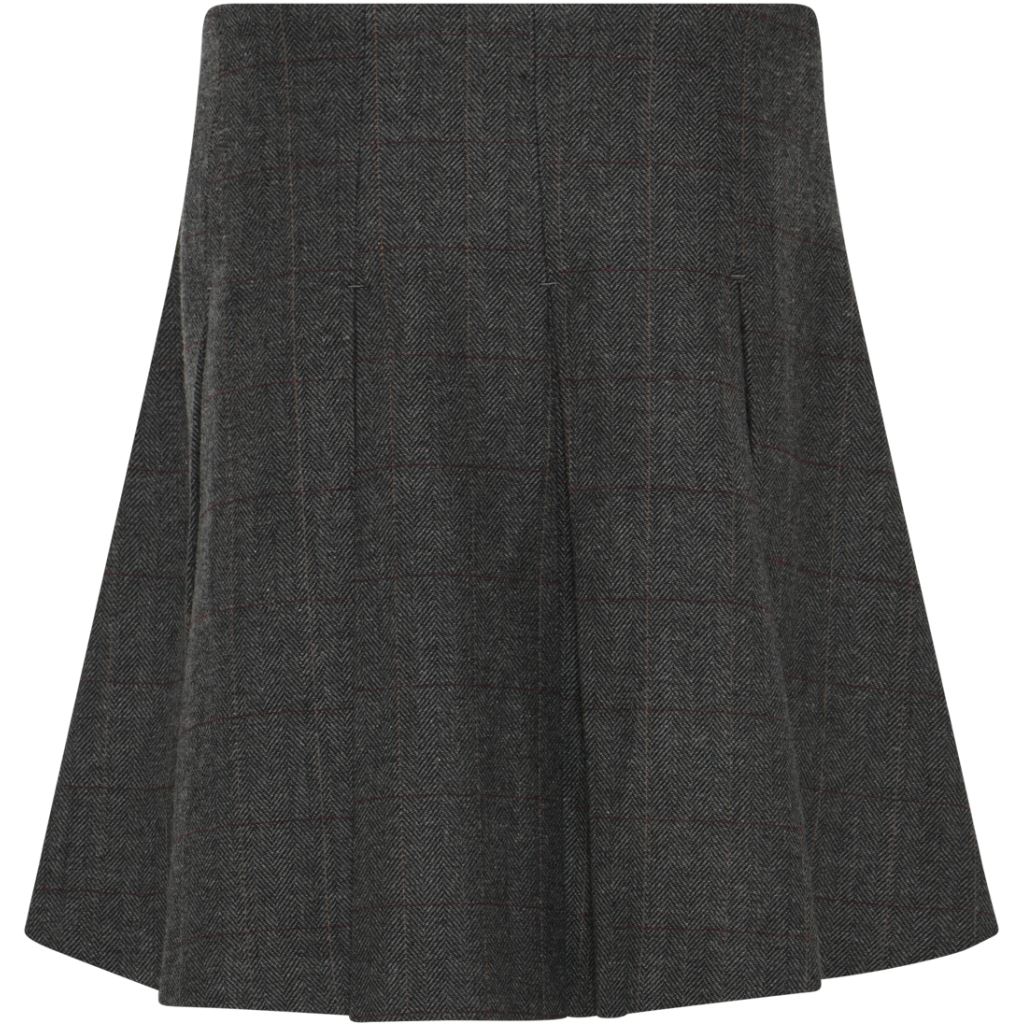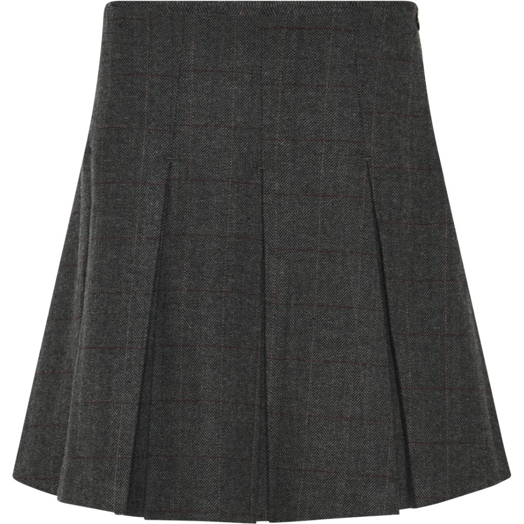 Checki Skirt har et flatterende A-snit med strukturerede læg og et elegant ternet mønster i mørkegrå / brune nuancer. En tidløs style der både kan styles preppy og afslappet – perfekt til efteråret og vintergarderoben.