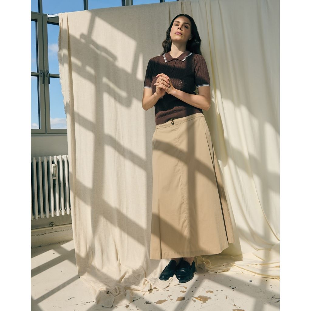 Den er syet i den samme luksuriøse bomuldspoplin, der falder let og føles behagelig mod kroppen. Taljen har fået et nyt udtryk med elastik bagpå og i siderne for en flatterende og komfortabel pasform, mens fronten er glat og afsluttet med to fine pynteknapper for et sofistikeret look.