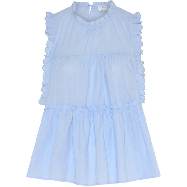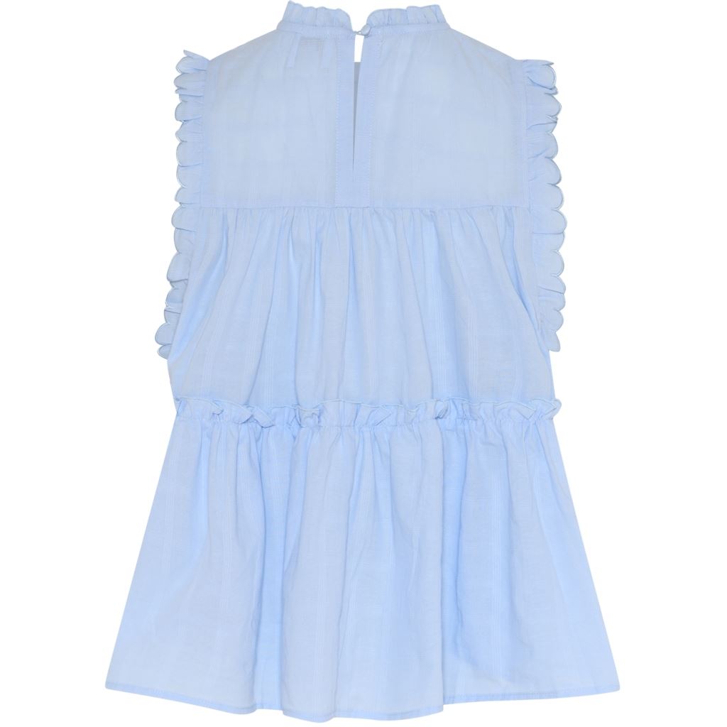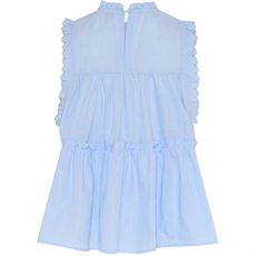 Julie Frill Top er en let bluse uden ærmer, opdelt i tre flæser, der skaber en smuk og løs A-form. Den har fine flæsekantdetaljer omkring ærmegabene, halsen og over den nederste flæse. Bagpå er en enkel lukning i nakken med knap og loop, som giver et diskret og elegant finish.