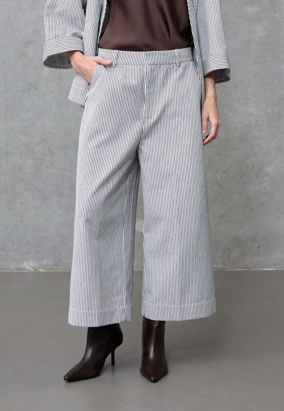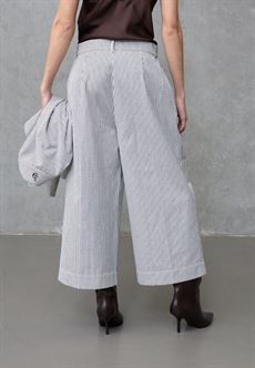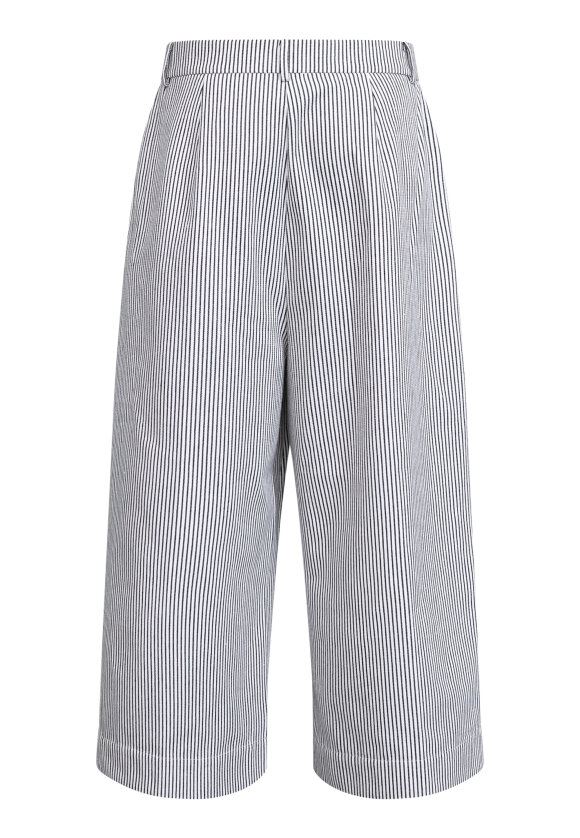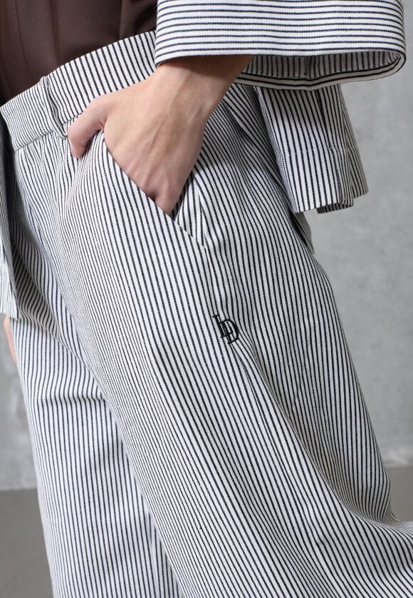 love1520 er et par wide-leg bukser med klassiske striber og en flatterende pasform. Designet forener et tailored look med moderne pinstripe detaljer og et broderet logo ved lommen. Modellen har en str. S på og er 175 cm høj.
