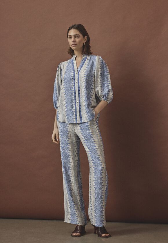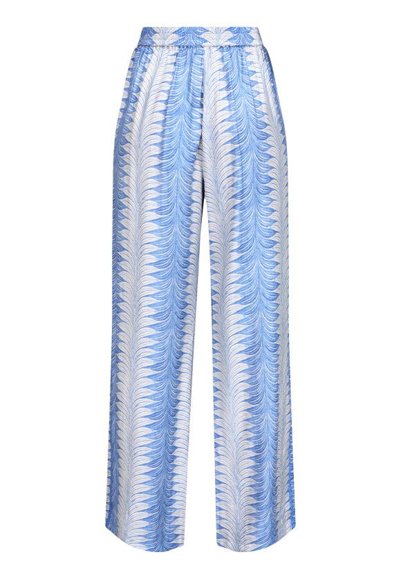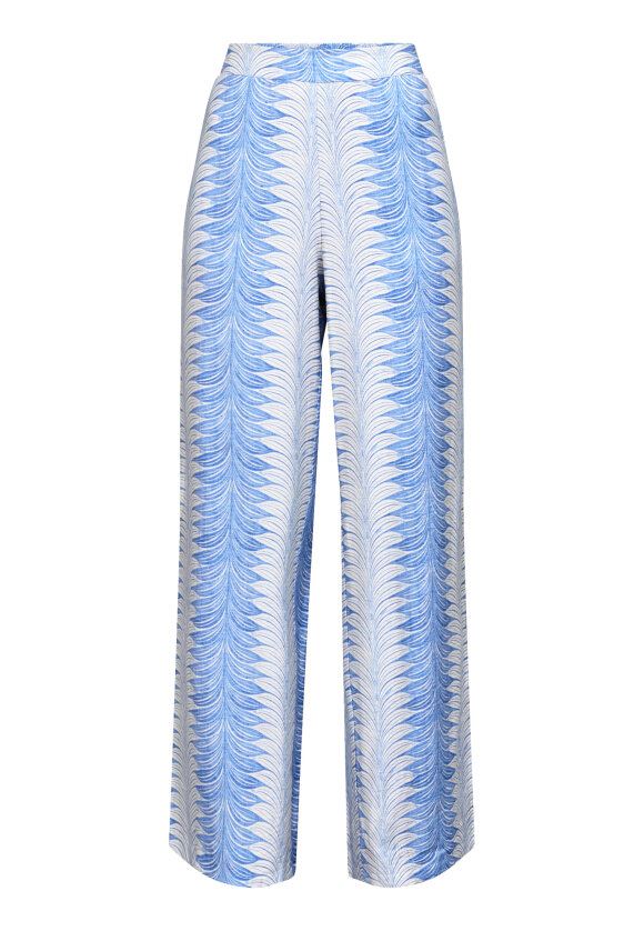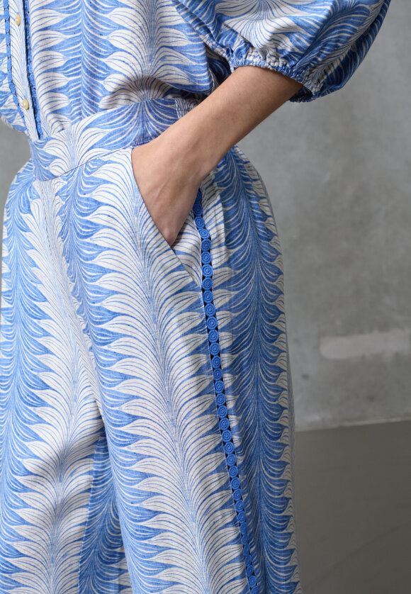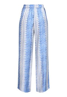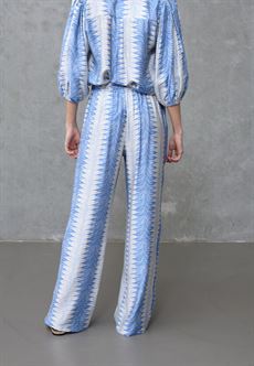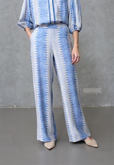 love1024-61 er en wide-leg buks i en let kvalitet med et dynamisk grafisk print. Bukserne har en flatterende høj talje med elastik bagpå og praktiske sidelommer. Modellen har en str. S på og er 171 cm høj.