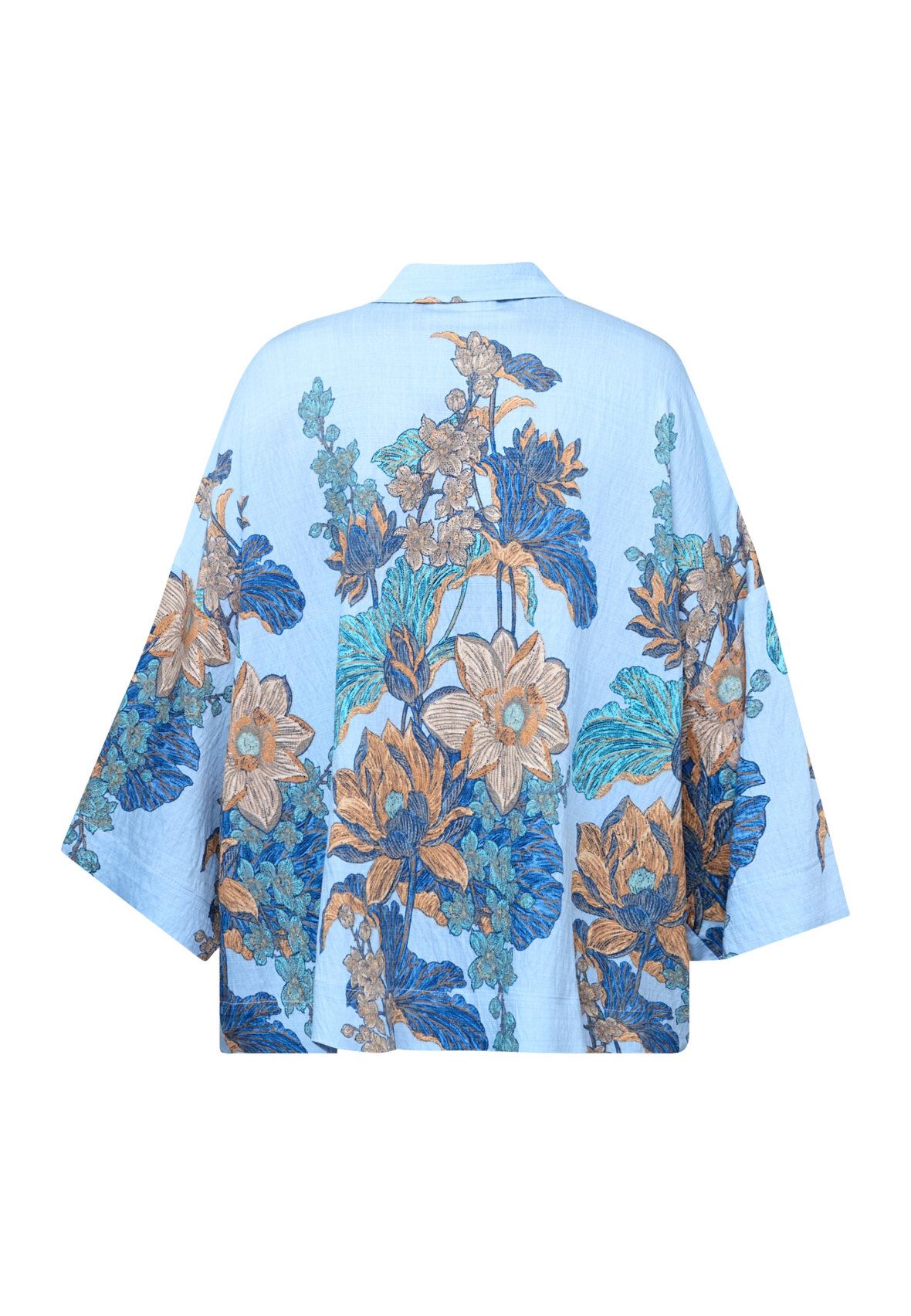 Skjorten har lave skuldersømme, brede trekvartærmer og en klassisk krave. Modellen har en str. S på.