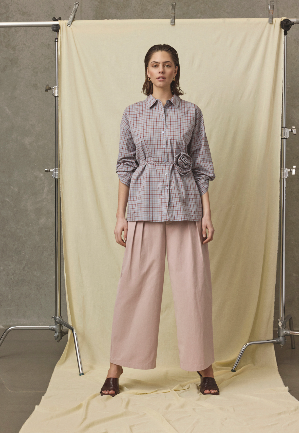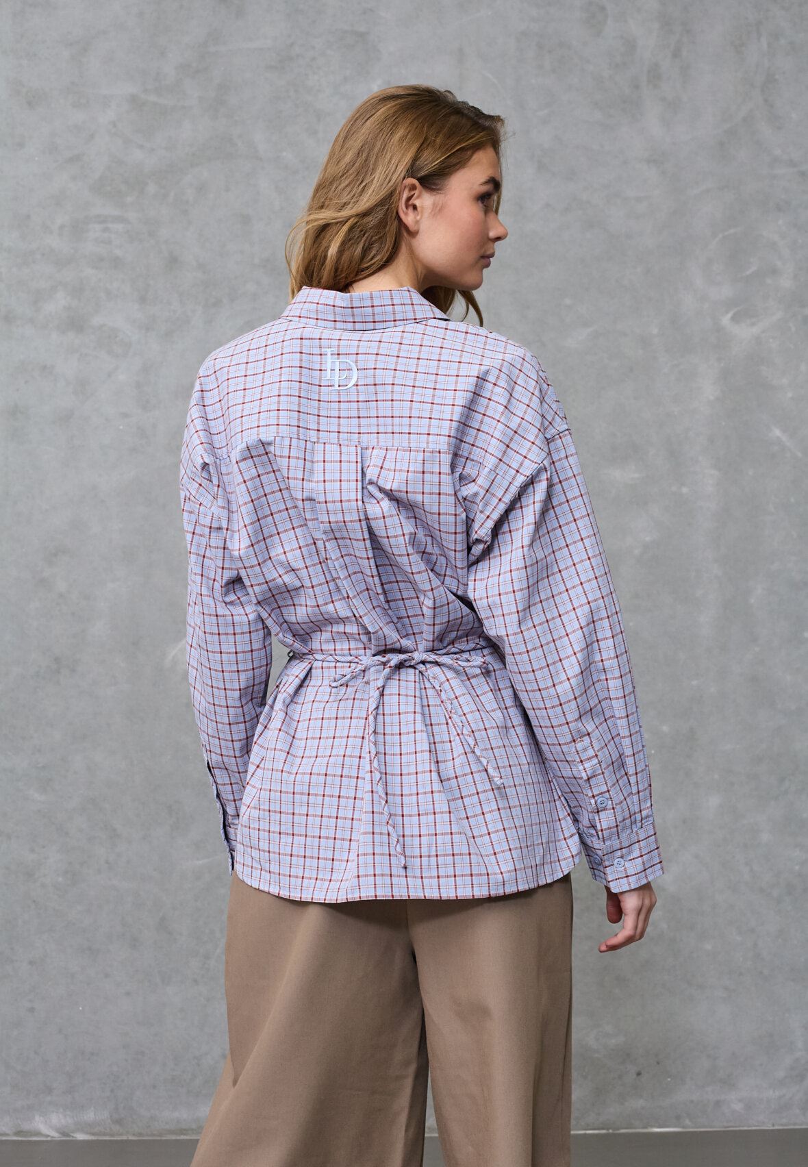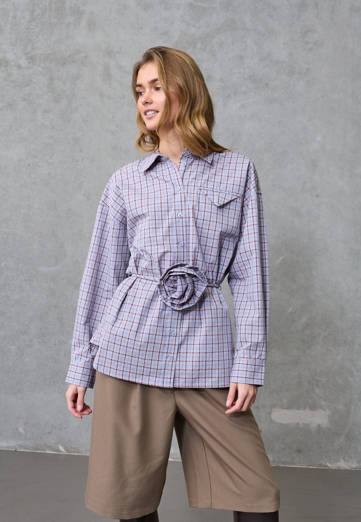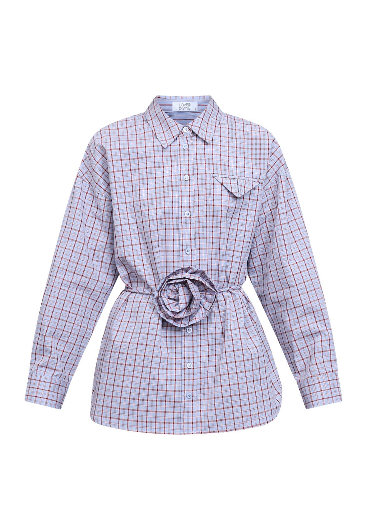 Love1488 er en cool ternet skjorte fra Love & Divine med en unik 3D-blomsterdetaljer og bindebånd i taljen for en feminin silhuet. Skjorten har skjult brystlomme og et afslappet fit. Modellen har en str. S på.