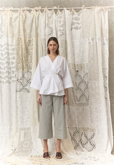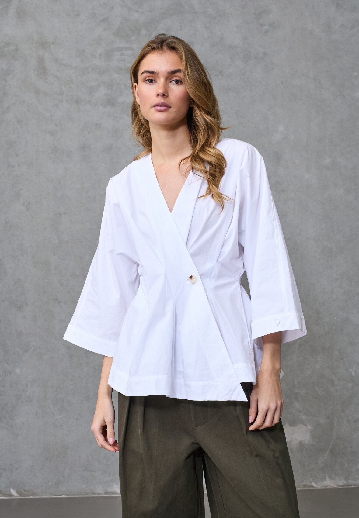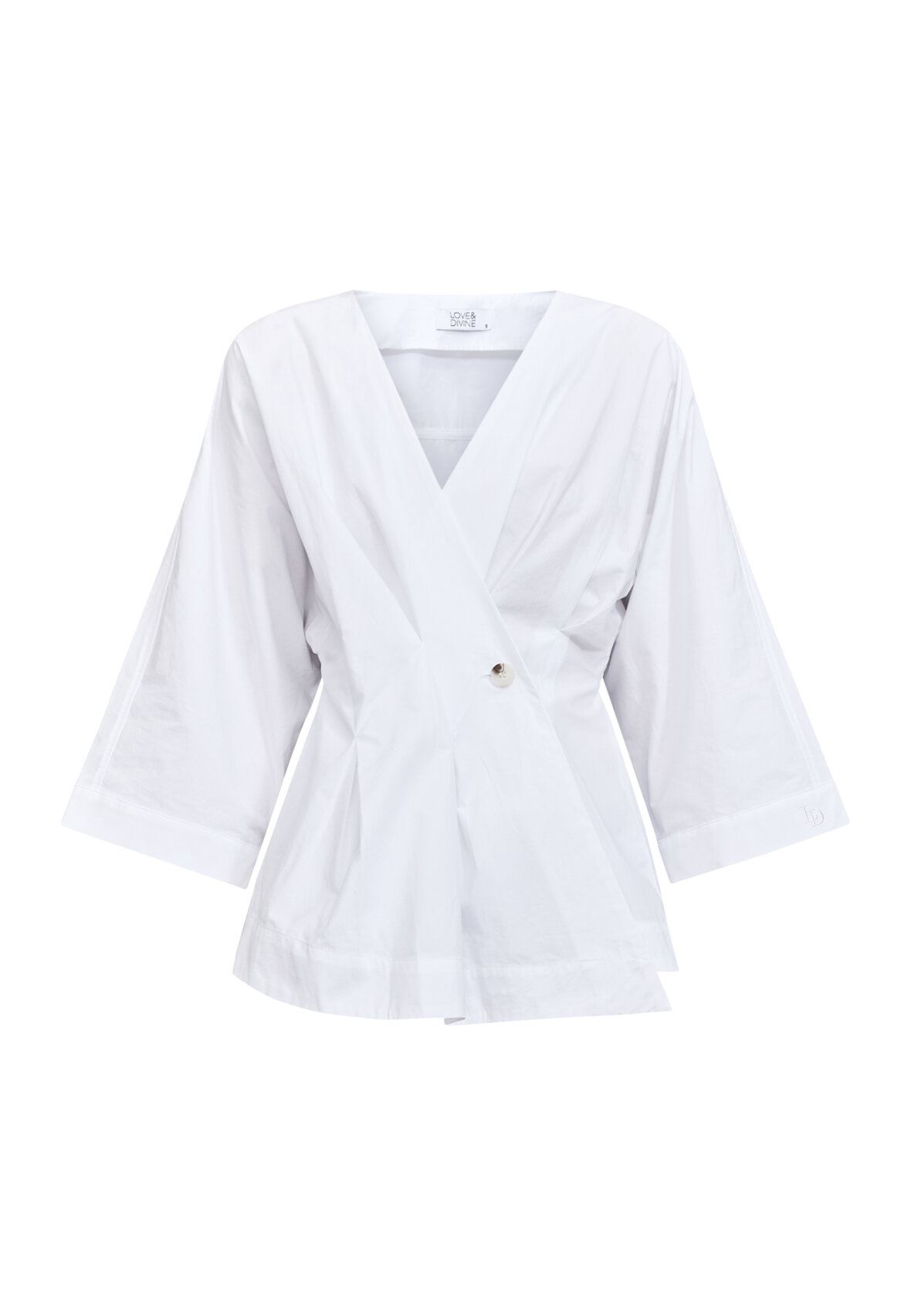 love1510 er en elegant peplum-bluse fra Love & Divine i oversized snit med et moderne afslappet look. Blusen har en flatterende wrap-effekt, dyb V-udskæring og brede trekvartærmer.