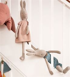 Kanin & hare-kollektionen er lavet af naturligt hør- og bomuldsstof, som gør dem lækre bløde. Denne kanin er klædt i en overall.