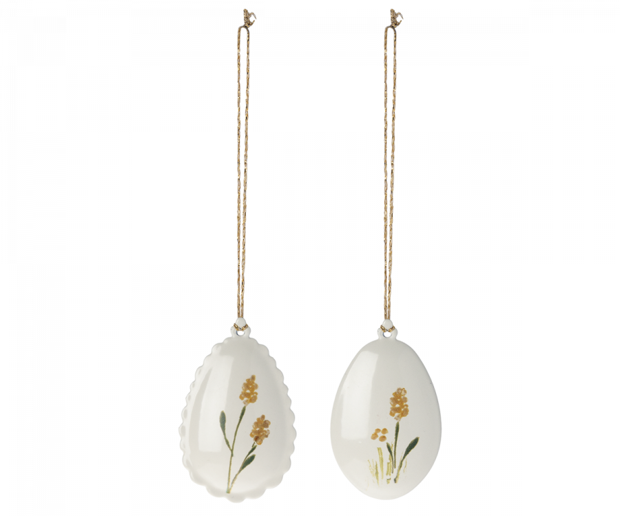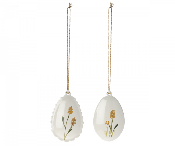 Påskeæg, metalophæng med håndmalede detaljer, to slags kanter. De er smukke som pynt på en gren eller som dekoration på påskebordet. Bland de forskellige farver med andet Maileg påskepynt for at fuldende påske udtrykket.