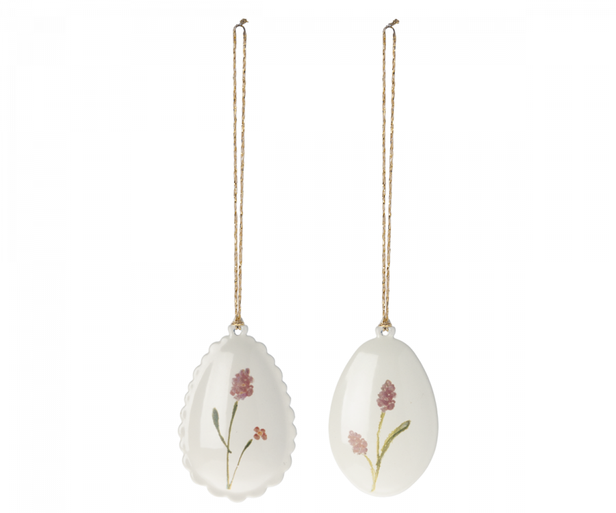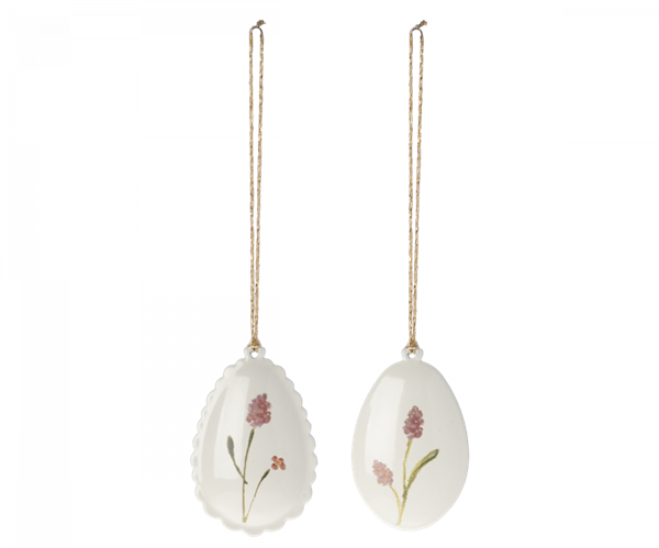 Påskeæg, metalophæng med håndmalede detaljer, to slags kanter. De er smukke som pynt på en gren eller som dekoration på påskebordet. Bland de forskellige farver med andet Maileg påskepynt for at fuldende påske udtrykket.
