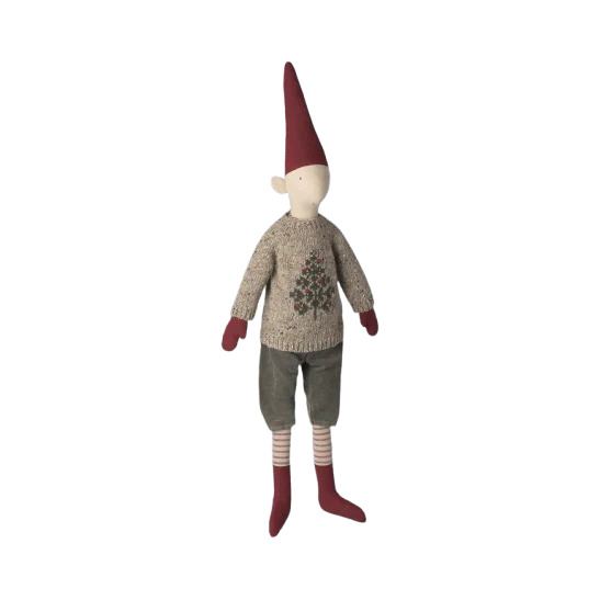 Denne nissedreng i størrelse 5 er klædt i fløjlsbukser og striktrøje.