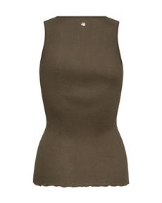 Sømløs tanktop i blød uld og modal, designet i en tætsiddende silhuet med ribdetaljer og en feminin flæsekant. En alsidig basisdel, som enten kan bruges under en tailored blazer eller en chunky strik for et charmerende touch.