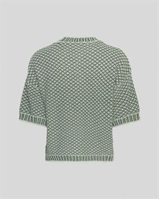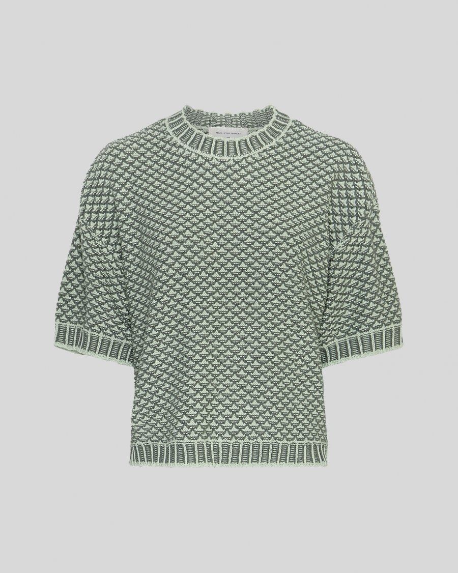 Strikket pullover med et grafisk mønster og afslappede korte ærmer. Designet har ribkant ved hals, ærmer og kant, hvilket giver et struktureret og moderne udtryk. En alsidig style, der fungerer både alene og over en skjorte.