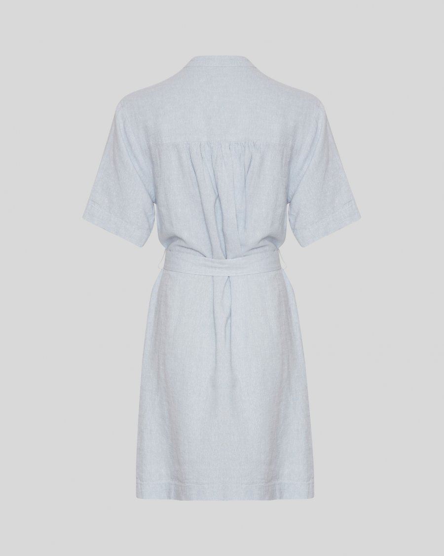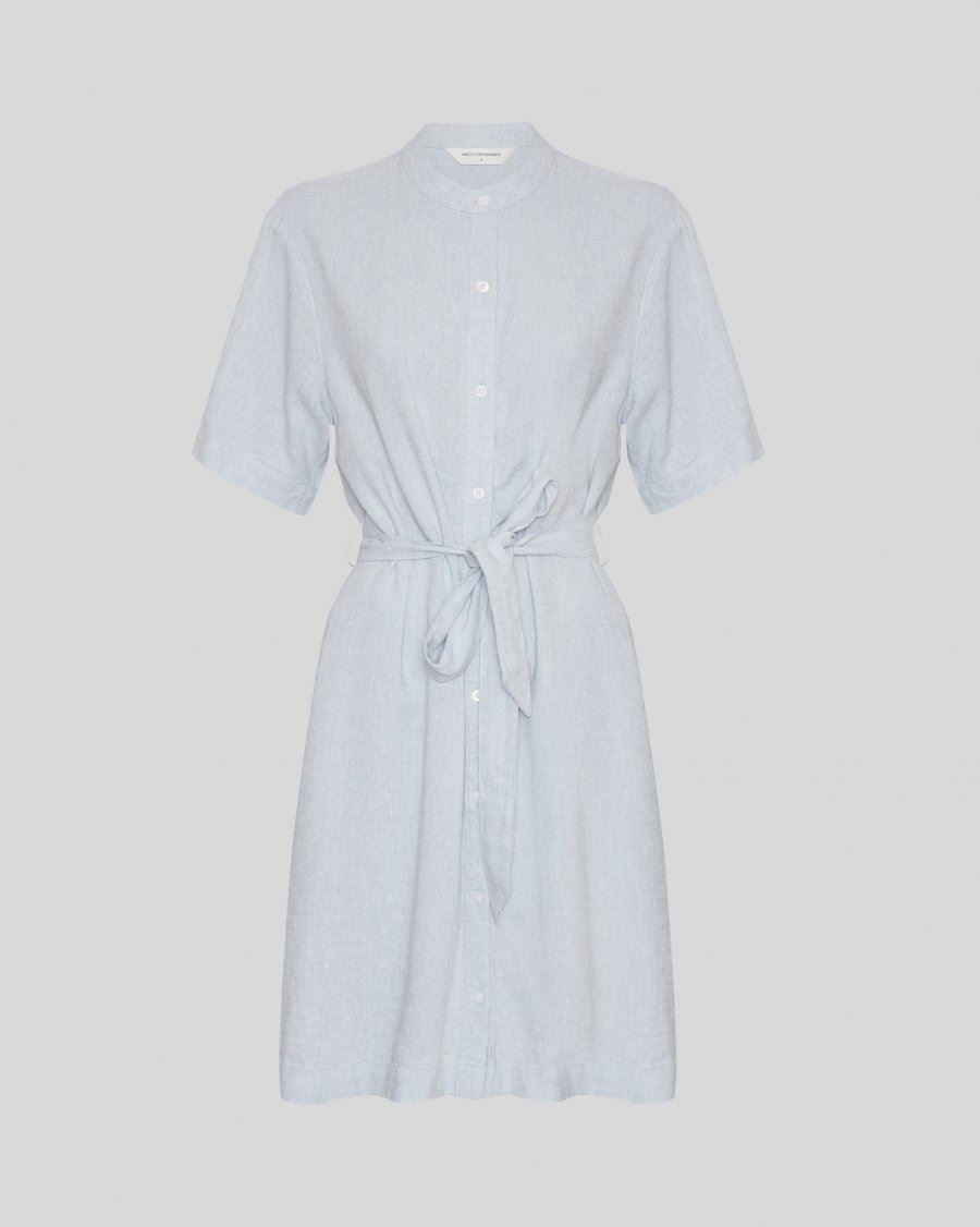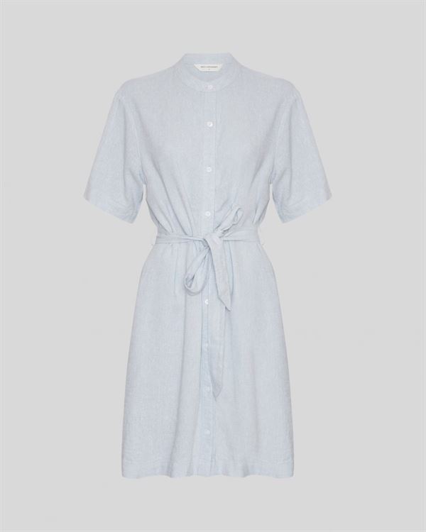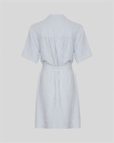 Kort skjortekjole med rund hals og mandarinkrave. Kjolen har knaplukning foran, sænkede skuldre og korte ærmer. Kjolen er designet med bindebælte i taljen for justerbar pasform.