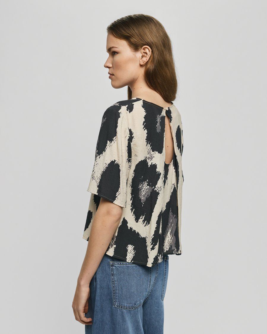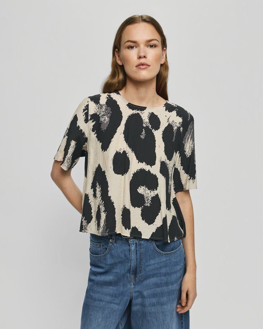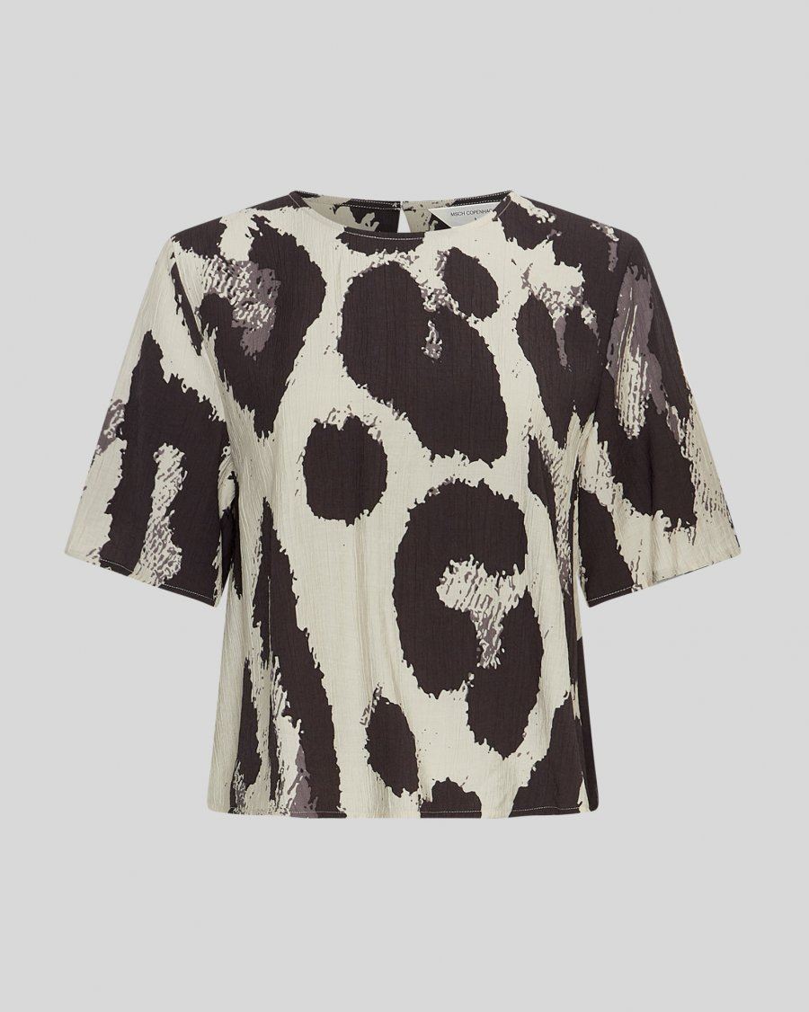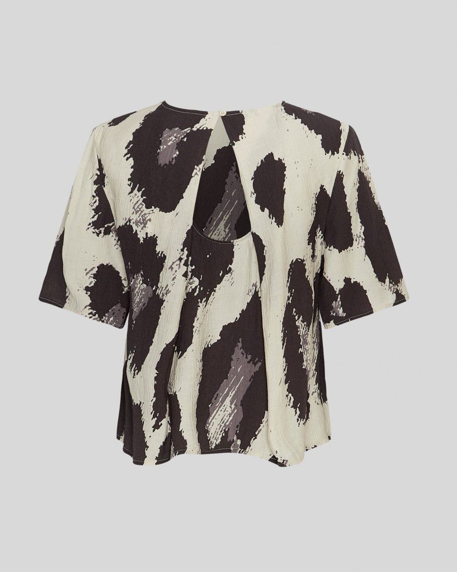 Denne top har et let og luftigt udtryk med et grafisk leo-inspireret print. Den er designet med korte ærmer, en løs pasform og et lille keyhole-udsnit bagpå, som giver et feminint og moderne touch. Materialet falder smukt og føles behageligt mod huden, hvilket gør toppen velegnet til både hverdag og mere formelle anledninger.