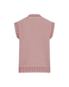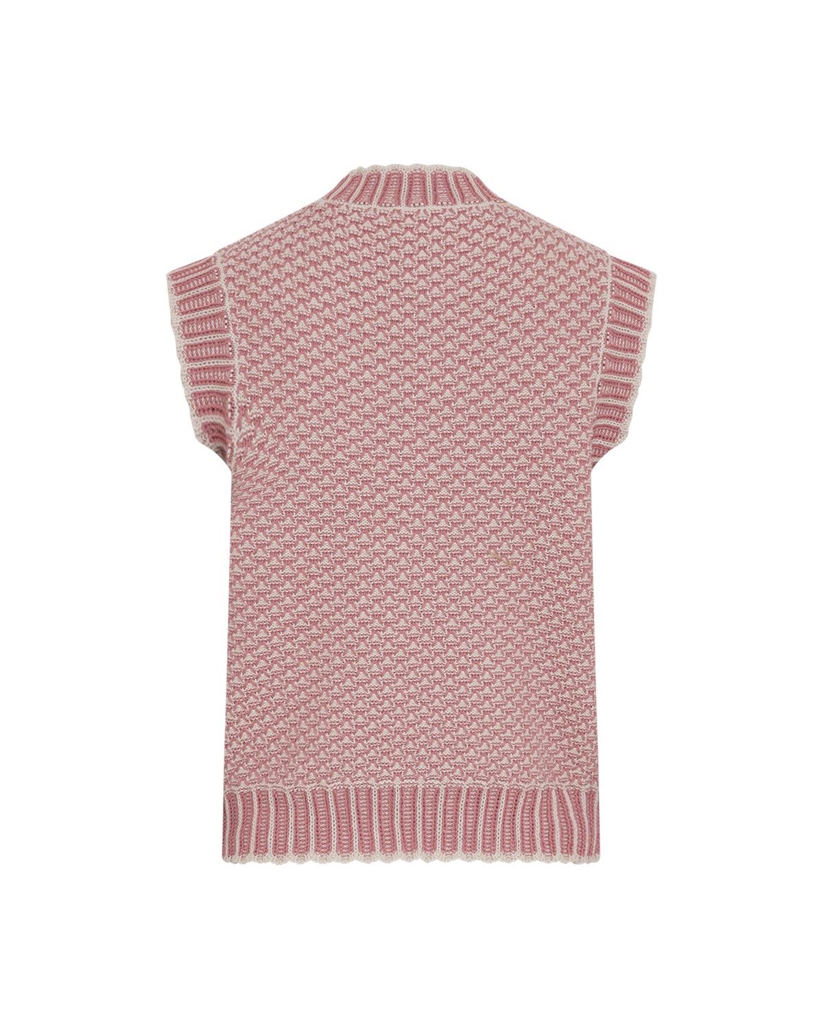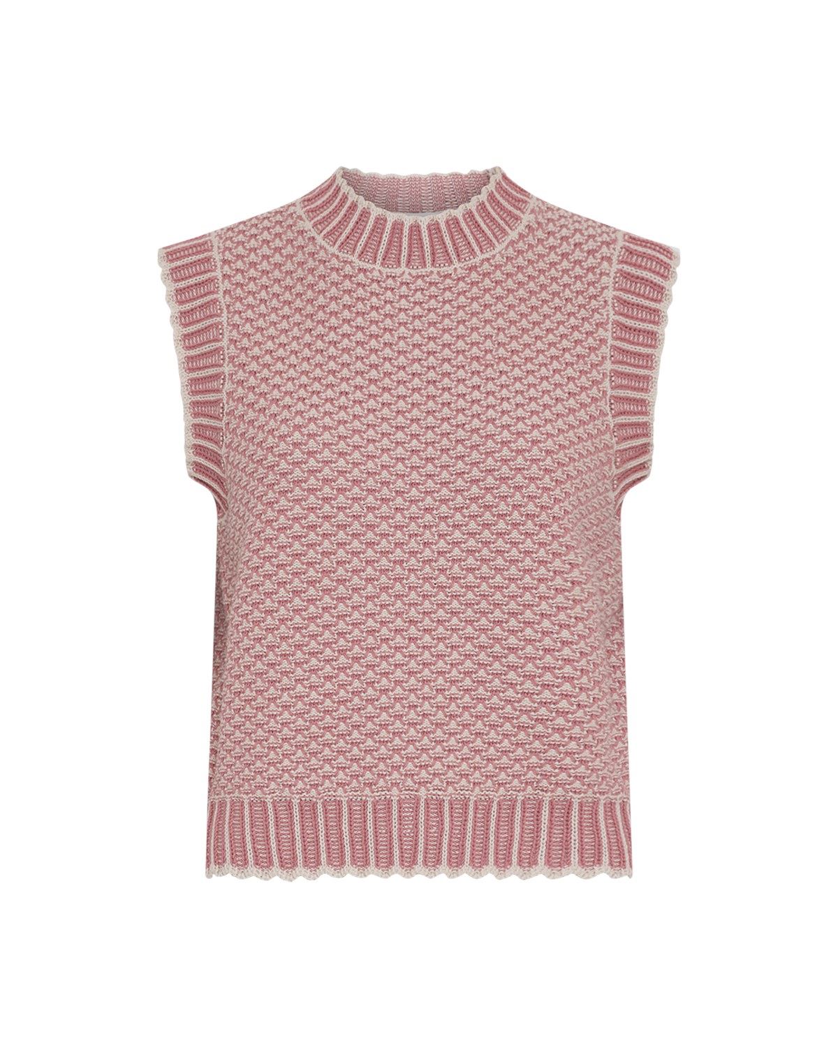 Strikket vest med tofarvet mønster. Ribbet halskant, ribbet bundkant og ærmeløse sidesnit.