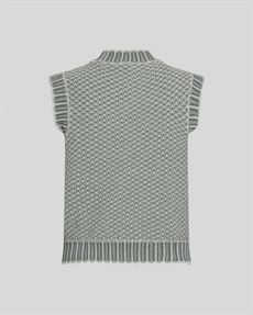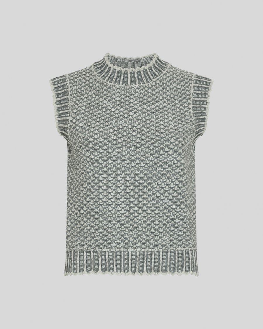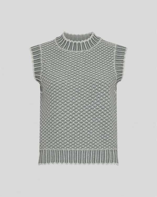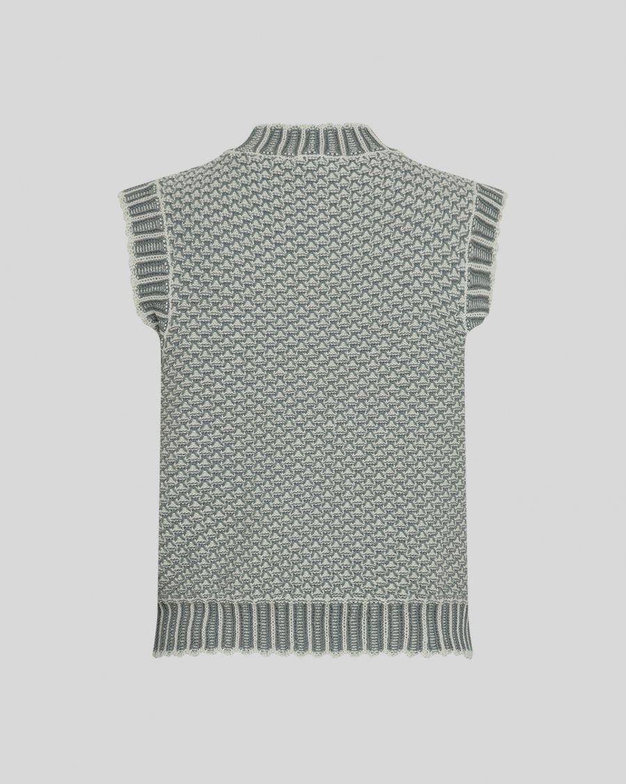 Strikket vest med tofarvet mønster. Ribbet halskant, ribbet bundkant og ærmeløse sidesnit.