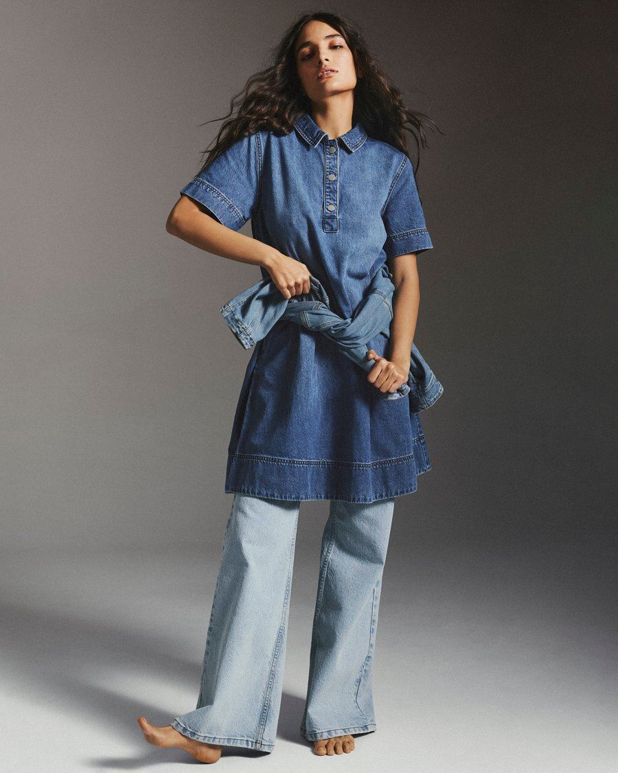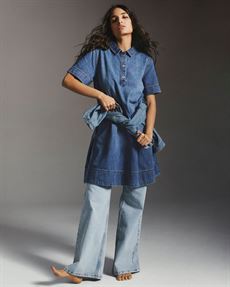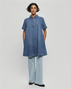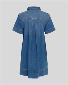 Kortærmet denimkjole i midi længde med klassisk krave og knaplukning ved halsen. Kjolen har en let A-formet silhuet med fald fra brystet og dekorative syninger. Fremstillet i 100 % certificeret bomuld.