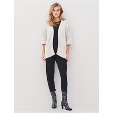 Denne cardigan har et afslappet og moderne udtryk med brede ribkanter og kontraststrik på ærmer og nederste kant. Den åbne front og de korte, vide ærmer giver en løs pasform, som gør den ideel til lag-på-lag styling. Det grove strik skaber en behagelig og varm kvalitet, der passer godt til både inde- og udelook.