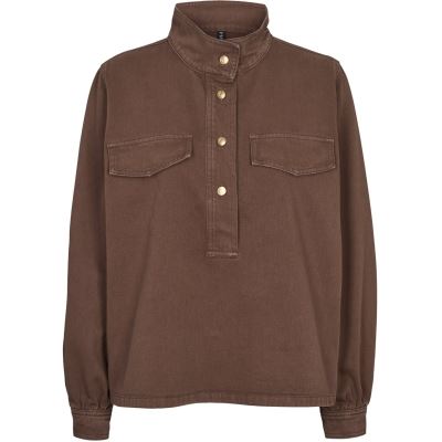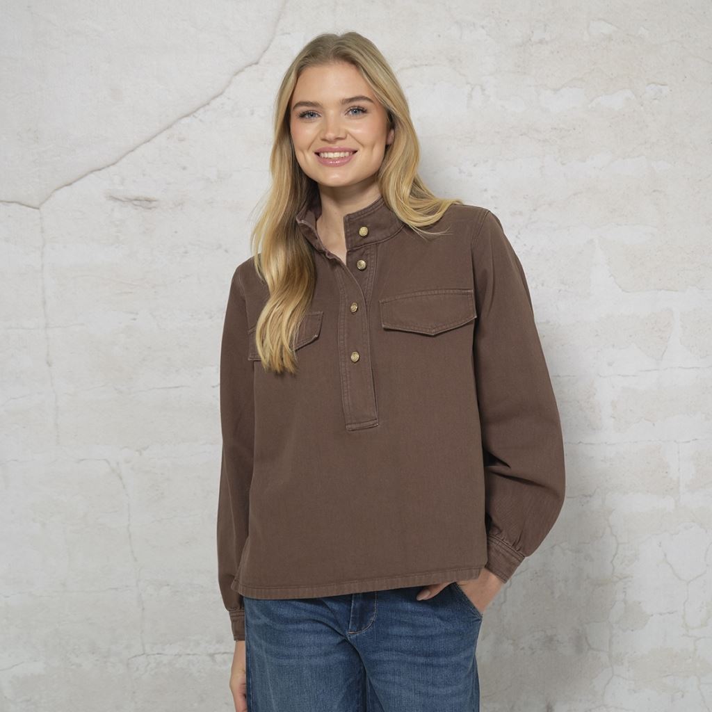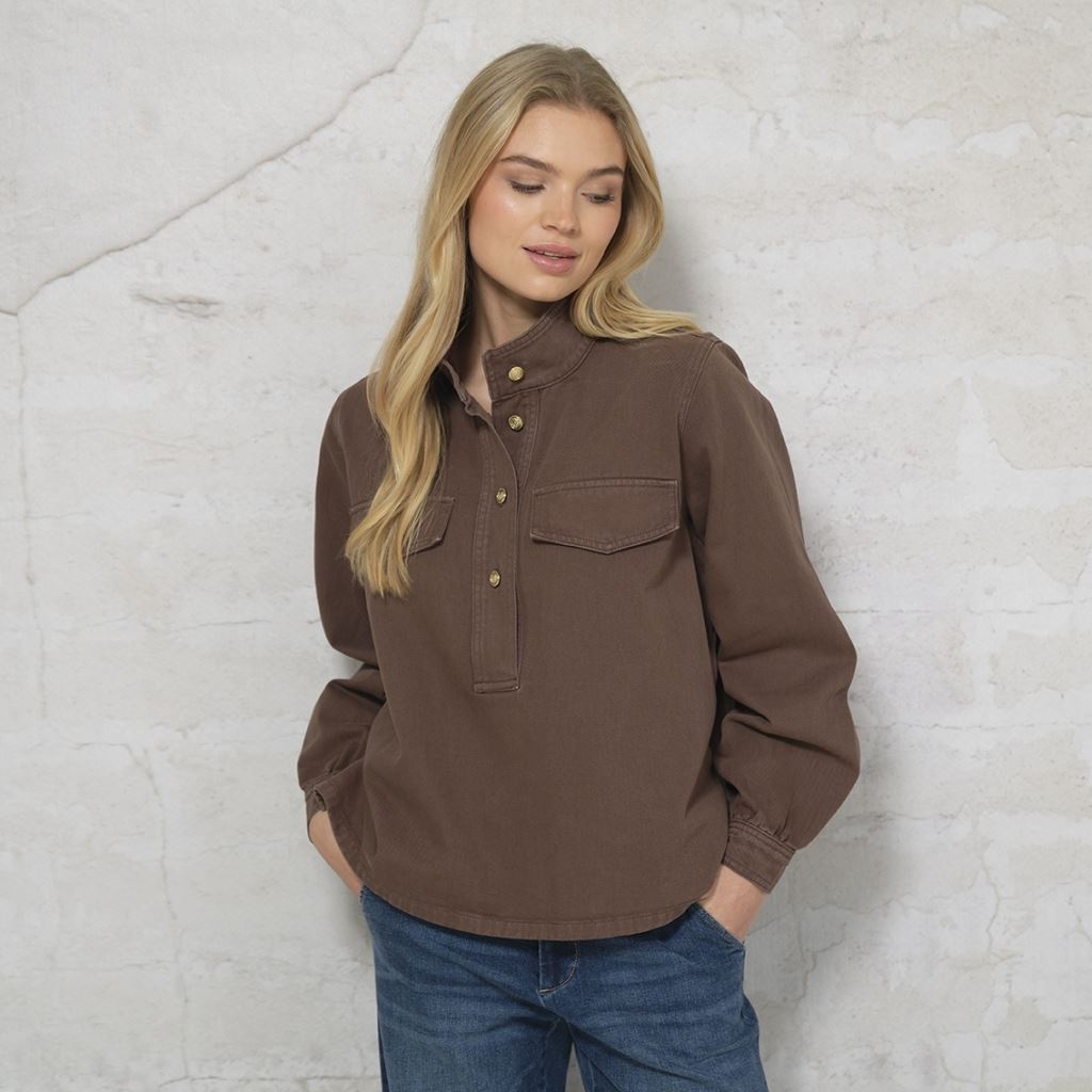 Bianca blouse i en skøn denimkvalitet. Den har en høj, stående krave og en halv knaplukning med fire guldknapper foran. Blusen har to pynte brystlommer og lange ærmer med synlige sømme, hvilket giver et afslappet og råt udtryk.