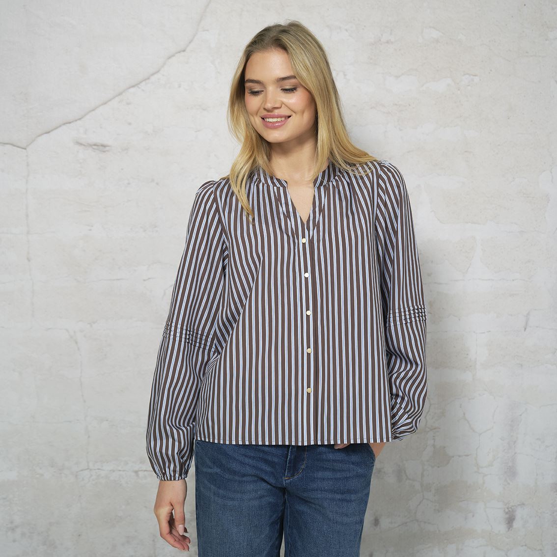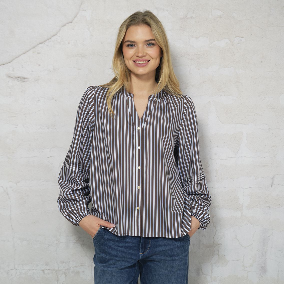 Harriet Blouse er en feminin og tidløs bluse med et elegant stribet mønster i blå og brunlige nuancer. Blusen har en let og luftig kvalitet, som falder flot på kroppen og giver en behagelig pasform. Den er designet med en diskret V-udskæring og gennemknapning foran med små, gyldne knapper, der tilfører et eksklusivt touch. De lange ærmer har let vidde og elastik ved håndleddene, mens fine lægdetaljer ved overarmen skaber ekstra form og elegance.
