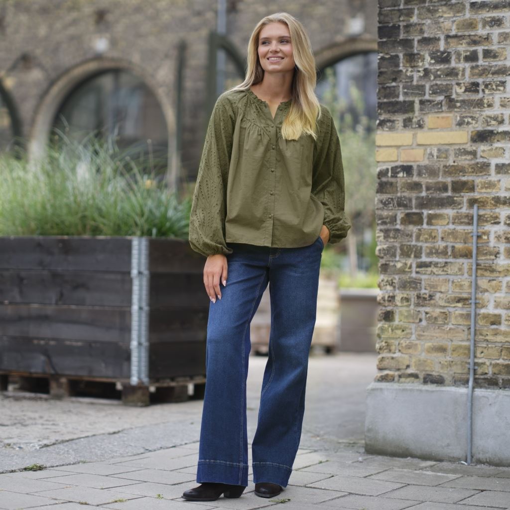 Sandra Blouse fra Prepair er en feminin og luftig bluse - her i en smuk olivengrøn farve. Blusen har rund halsudskæring med en lille flæsekant og knaplukning foran. Ærmerne er lange med elastik forneden og er dekoreret med smukke broderi anglaise-detaljer og små udskæringer, som skaber et let og elegant look. Broderi anglaise-detaljerne er ligeledes i et lille V ned foran på blusen. De fine læg foran og ved skuldrene tilføjer volumen og et afslappet fald, der gør blusen både komfortabel og stilfuld.